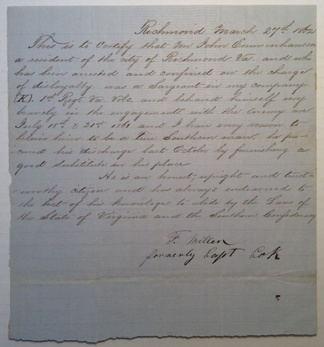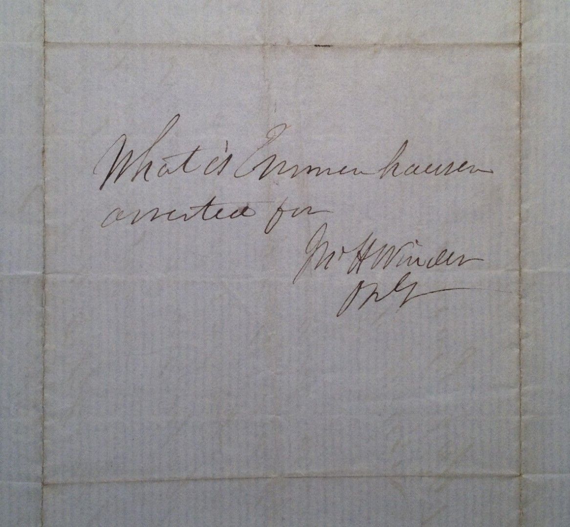 Richmond, 1862. unbound. very good. 1 page (front and back), 8.25 x 7.75 inches (torn from larger sheet), Richmond, Virginia, letter dated March 27, 1862. This note is signed by the Confederate Brigadier General who commanded prisoner-of-war camps throughout the South during the war. Signature is on the back of an appeal letter by a captain hoping to clear a soldier accused of disloyalty. From the letter: "This is to certify that Mr John Emmenhauser a resident of the city of Richmond Va. and who has been arrested and confined on the charge of disloyalty was a Sargeant in my company (K) 1st Regt. Va. Vols. and behaved himself very bravely in the engagements with the Enemy on July 8th & 21st 1861 and I have every reason to believe him to be a true southern man..." Winder's note on the back says, "What is Emmenhauser arrested for Jon H. Winder B.G." Uneven edge on the bottom of the letter; browning along natural folds. Very good(-) condition.