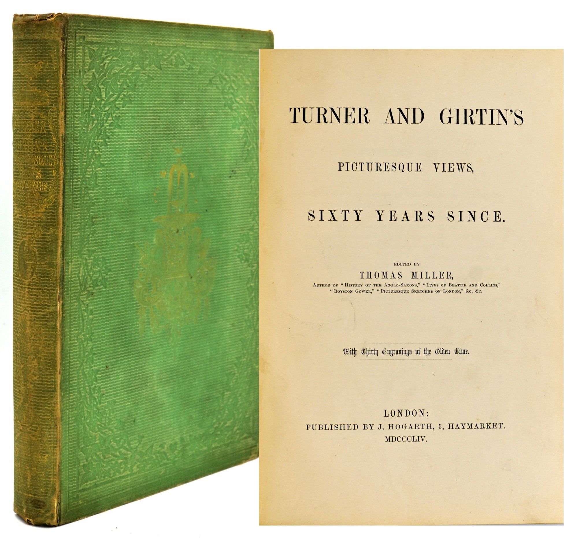 London: J. Hogarth, 1854. First Edition. Hard Cover. Very Good binding. Quarto; in publisher’s bright green embossed cloth, with faded gilt stamping of a rather charming fountain to the front board, and titling to the spine; there is some wear to the extremities, and mylar has been cut to protect the binding; mostly a clean copy, though is a bit of quite scattered foxing; the plates appear clean.~~Turner and Girtin were friendly rivals -- this work is certainly even-handed with 15 full-page engravings by Turner and 15 by Girtin, with a tailpiece drawing by Girtin and a frontispiece of Turner by Count d’Orsay. Folding facsimile letter by Turner, and 2 additional facsimile Turner letters. Very Good binding.