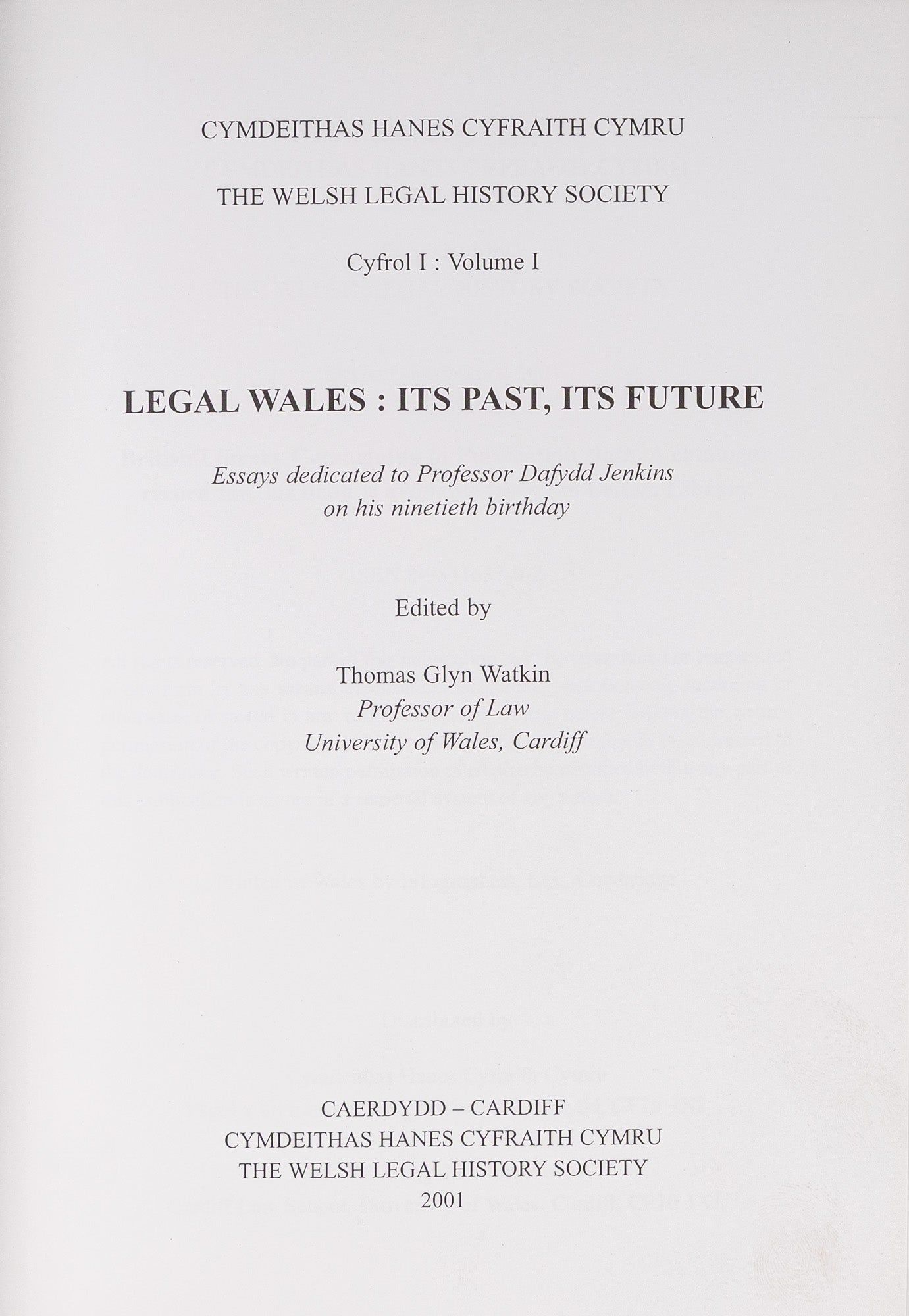 2001. Watkin, Thomas Glyn, Editor. Legal Wales: Its Past, Its Future Essays Dedicated to Professor Dafydd Jenkins on His Ninetieth Birthday. Cardiff, [U.K.]: The Welsh Legal History Society, 2001. xi, 186 pp. Blue cloth with gilt stamped spine and front cover. Moderate shelfwear with bumping to top edge of rear board. Internally clean. A very good copy. $25. * Contents: The Commote and County Courts of Wales, 1277-1350, Christopher McNall.; Legal Cultures in Mediaeval Wales, Thomas Glyn Watkin.; Sir William Jones, David J. Ibbetson.; Putting Oneself on Whose Country? Carmarthenshire Juries in the Mid-Nineteenth Century, Richard W. Ireland, Sir John Nicholl of Merthyr Mawr: The Reform of the Testamentary Jurisdiction of the Ecclesiastical Courts, Brian Hutton.; 'Un o'r Barnwyr Doethaf Erioed': Lord Atkin of Aberdovey v. The Archbishop of Wales et al, The Venerable Anthony Crockett.; Legal Wales: Its Modern Origins and its Role after Devolution: National Identity, the Welsh Language and Parochialism, The Honourable Mr. Justice Thomas.; A Voice for Wales: The National Assembly for Wales, David Lambert.