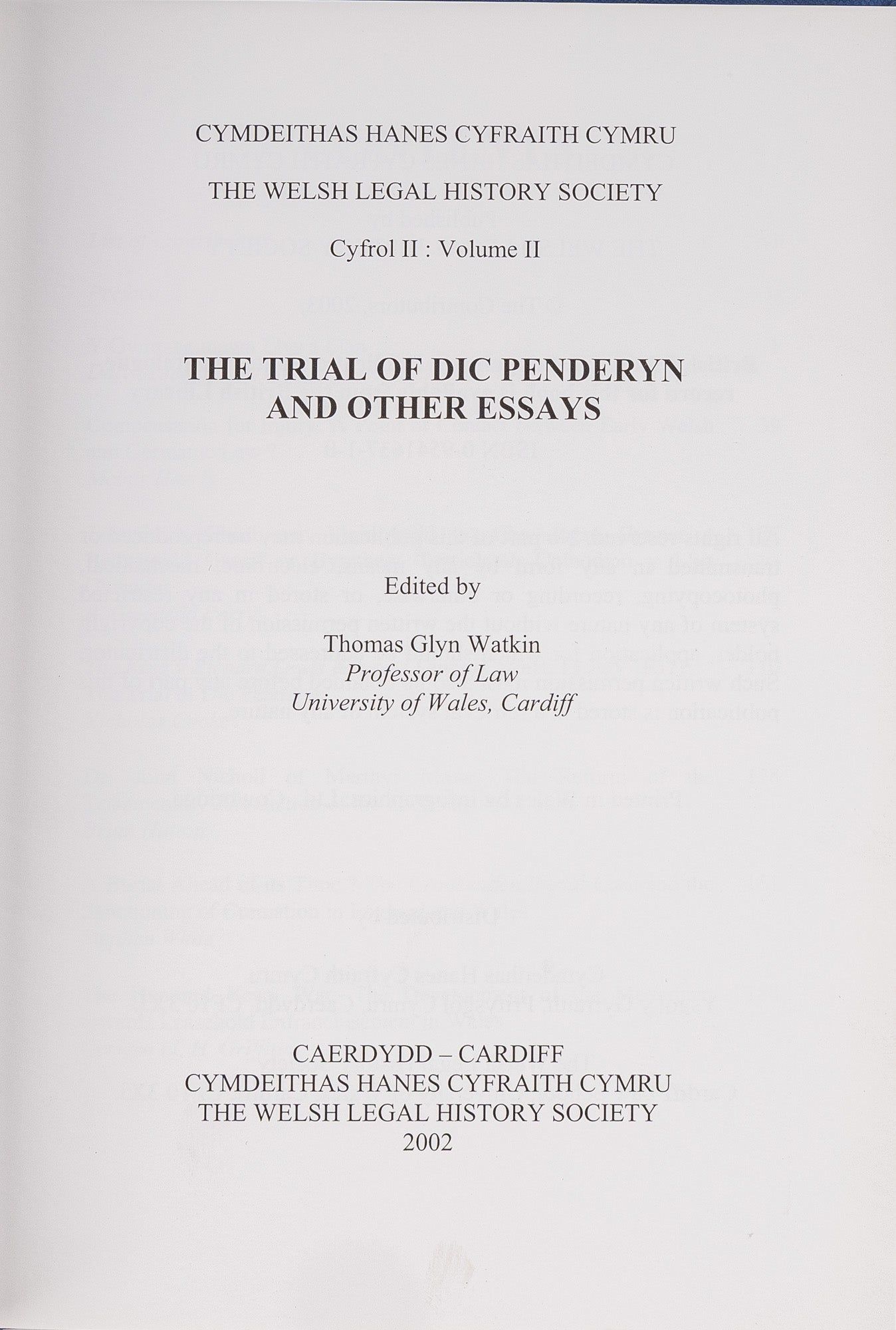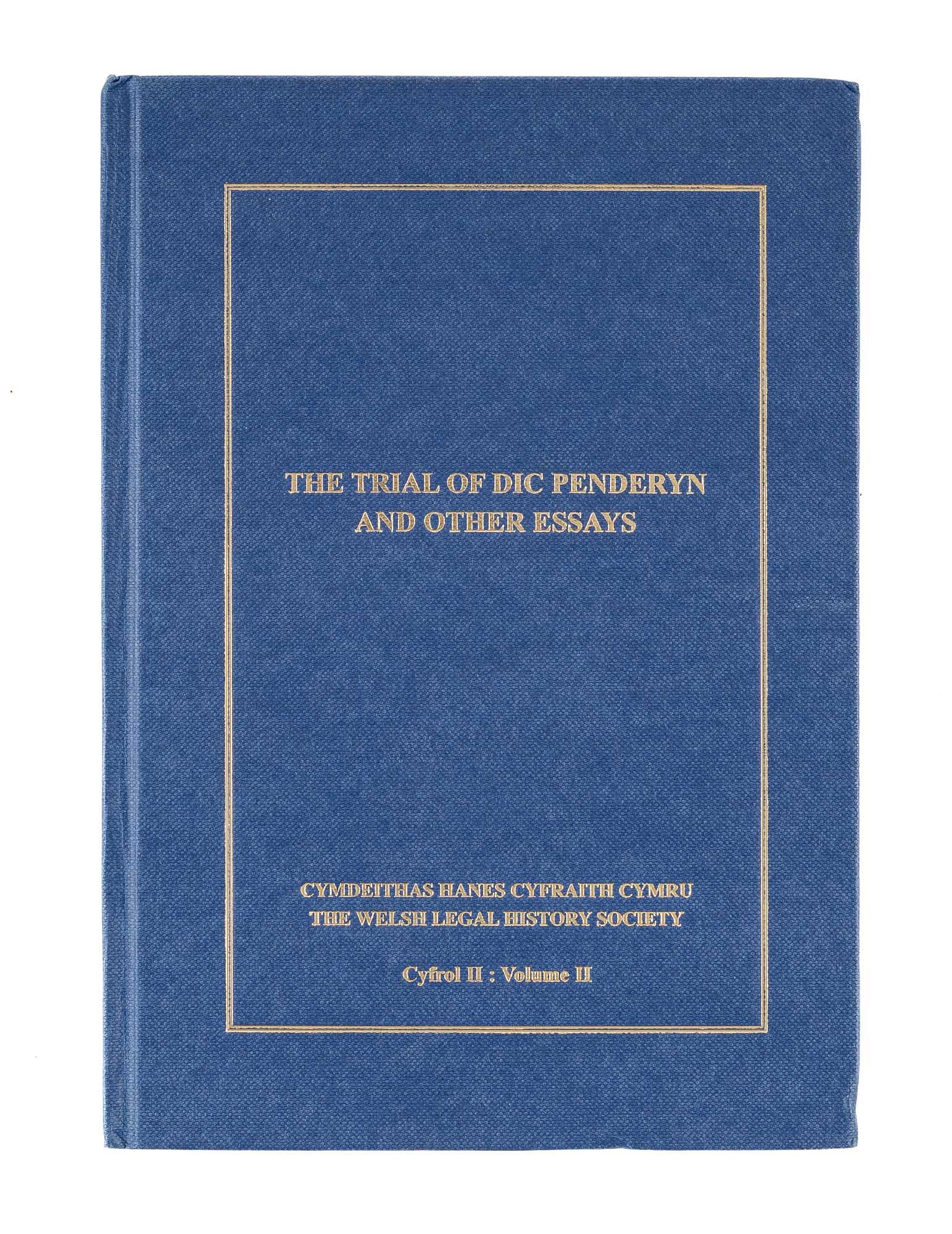 2003. Watkin, Thomas Glyn, Editor. The Trial of Dic Penderyn and Other Essays. Cardiff, [U.K.]: The Welsh Legal History Society, [2003]. x, 196 pp. Blue cloth with gilt stamped spine and front cover. Near fine. Internally clean. $75. * Contents: Y Gymraeg mewn llys a llan, Dafydd Jenkins; Compensation for Injury: A Point of Contact Between Early Welsh and Germanic Law?, Meinir Harris; Trosedd a chosb ym Meirionydd yn chwedegau cynnar y bedwaredd ganrif ar bymtheg: Tystiolaeth cofnodion y llys chwarter, R. Gwynedd Parry; The King v Richard Lewis & Lewis Lewis (Cardiff, 13 July 1831): The trial of Dic Penderyn, Nicholas Cooke; Dr. John Nicholl of Merthyr Mawr: The Reform of the Testamentary Jurisdiction of the Ecclesiastical Courts, Brian Hutton; A Burial Ahead of Its Time?: The Crookenden Burial Case and the Sanctioning of Cremation in England and Wales, Stephen White; The Hundred Years War: The Development of the Movement Towards Leasehold Enfranchisement in Wales, Gerwyn LI. H. Griffiths.