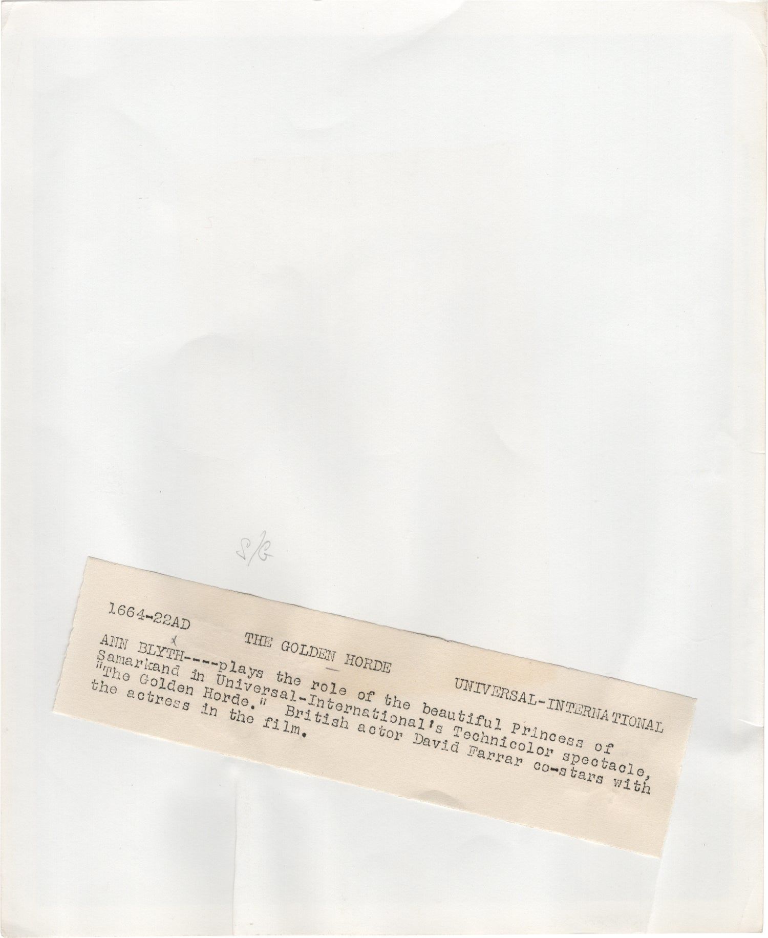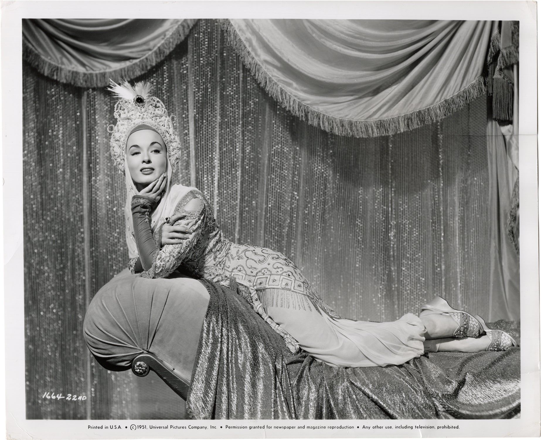 Universal City: Universal-International, 1951. Vintage publicity photograph from the 1951 film, showing actress Ann Blyth in costume as Princess Shalimar. Printed mimeo snipe affixed to the verso.