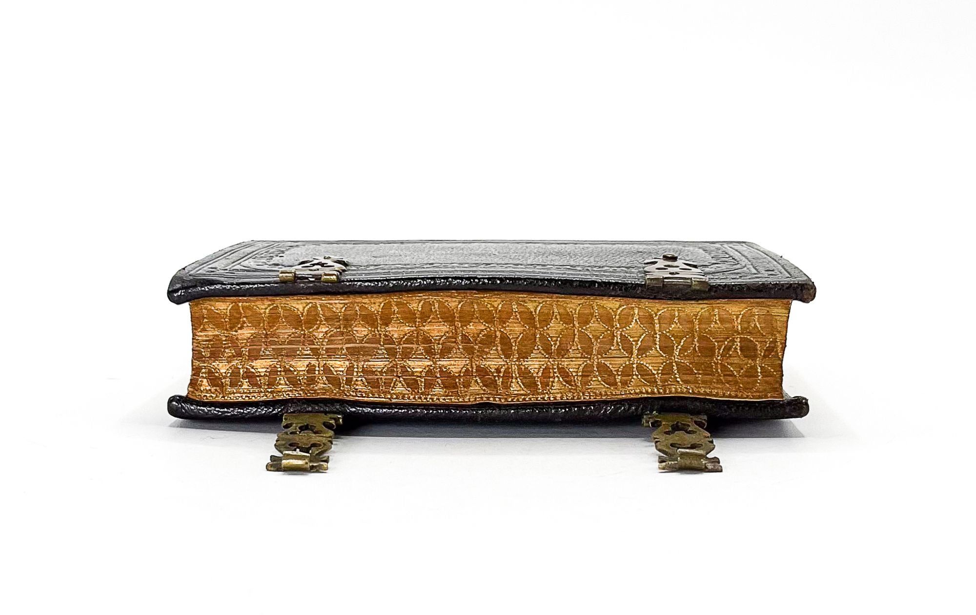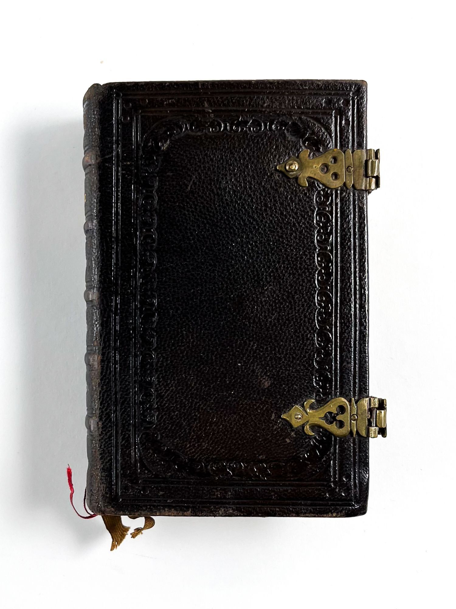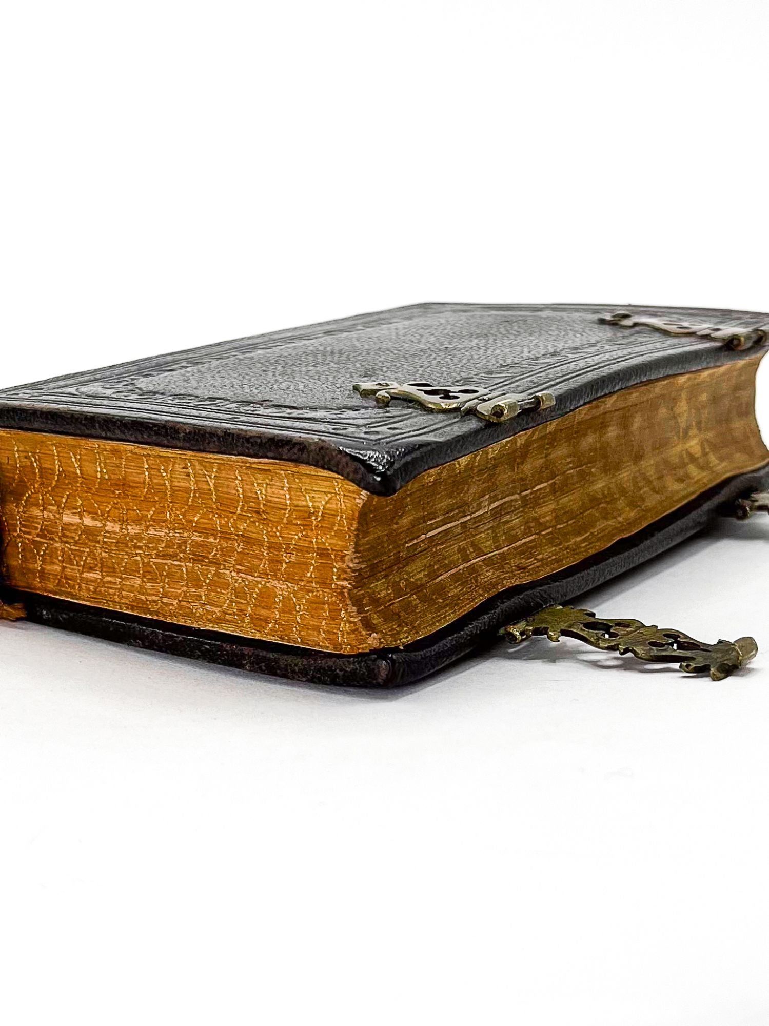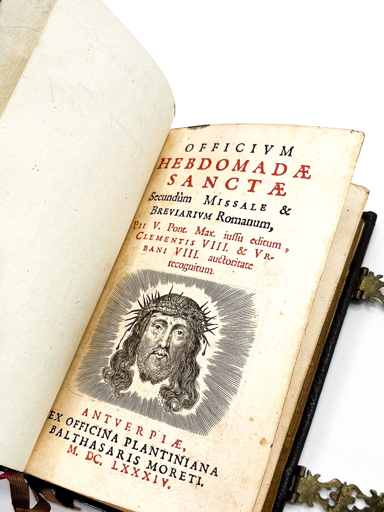 Antwerp: ex officina Plantiniana Balthasaris Moreti [Plantin Press Balthasar Moretus], 1684. Near fine.. Beautifully bound Plantin edition of this fundamental collection of liturgies for the week leading up to Easter. An important and commonly reprinted liturgical collection in a finely printed Plantin edition in black and red ink. This copy was rebound in the Victorian era with traits typically found on more deluxe productions of religious texts in that era: goatskin leather, brass clasps, gilt and gauffered edges. USTC locates nine copies, with FirstSearch adding a few more, but none recorded at American institutions. A striking artifact of Victorian aesthetic transformation. 12mo, 6'' x 3.5''. 19th-century full brown goatskin with multiple rules in blind, raised bands, gilt-lettered spine, two brass clasps at fore-edge. Marbled endpapers, gauffered edges, multiple ribbon markets. Illustrated with engraved title-page vignette, 5 engraved plates, and woodcut initials. Printed in red and black. 655, [1] pages, collated complete. Ink gift inscription dated 1879 to second fly leaf; embossed bookplate of Hallam Webber laid in. Light rubbing to joints; text with some foxing and browning. Housed in custom paper faux-vellum solander case with marbled interior.