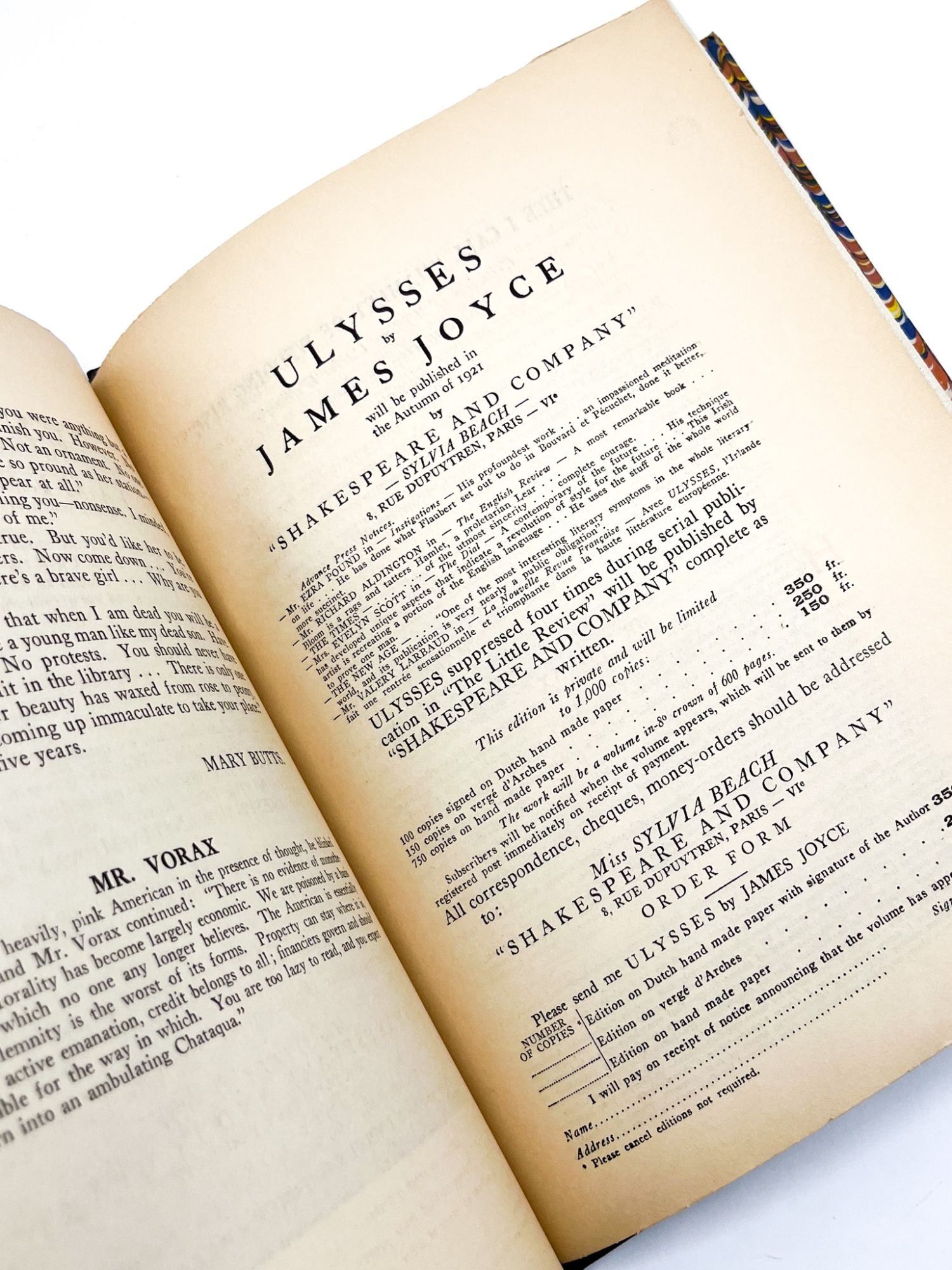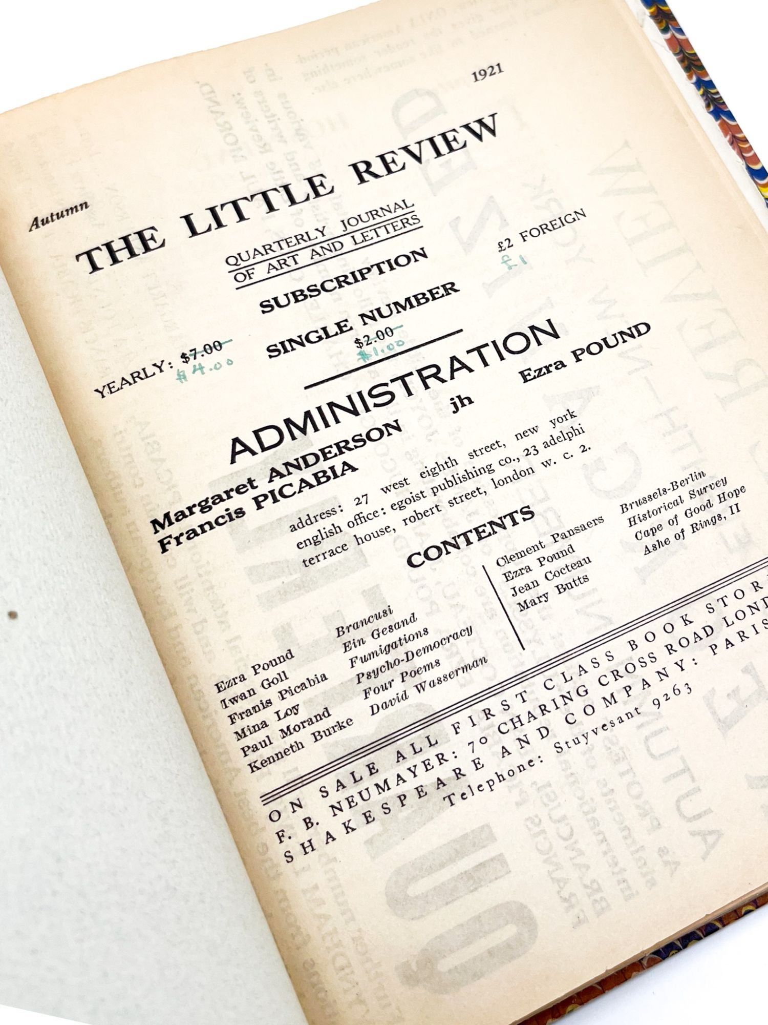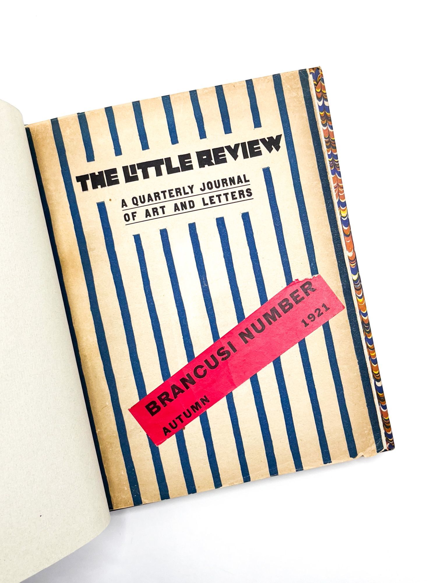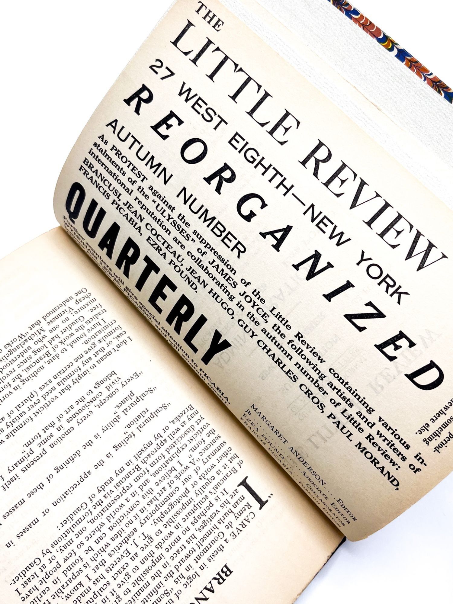 New York: Margaret Anderson, 1921. First edition. Near fine.. Brancusi tribute issue of the celebrated Modernist journal, published in protest after the persecution and prosecution of the editors for their publication of ULYSSES. Founded in 1914, THE LITTLE REVIEW soon gained a reputation for its experimental approach to art, literature, and politics alike. After enduring arrest and trial in 1920-1 for daring to print installments of Joyce's ULYSSES, Anderson and Heap decamped to Paris and continued to publish THE LITTLE REVIEW through the end of the decade. This issue's bold announcement: "As PROTEST against the suppression of the Little Review containing various instalments of the "ULYSSES" of JAMES JOYCE, the following artists and writers of international reputation are collaborating in the autumn number of THE LITTLE REVIEW: BRANCUSI, JEAN COCTEAU, JEAN HUGO, GUY CHARLES CROS, PAUL MORAND, FRANCIS PICABIA, EZRA POUND." Contains a full-page advertisement and order form for Sylvia Beach's own famous and then-forthcoming publication of ULYSSES.