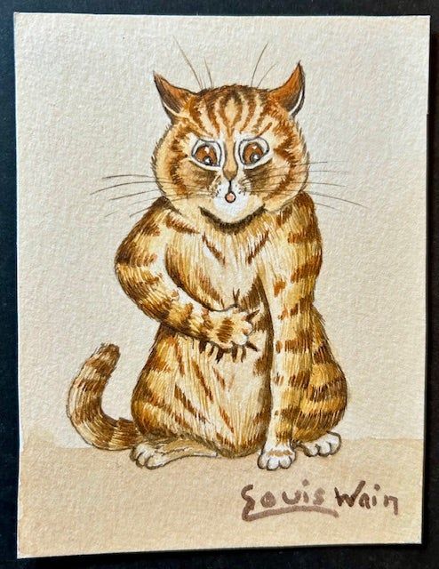 Ephemera. Near Fine. Louis Wain. Wonderful original Louis Wain watercolor of another of his enigmatic, anthropomorphized cats. This one with claws extended, clutching at its stomach. On thick card stock, in lovely condition, with vivid light-brown and dark strokes and offsetting white splashes. SIGNED BY LOUIS WAIN AT THE FOOT OF THE WATERCOLOR. A diminutive but highly-accomplished portrait, measuring 4 1/2" tall x 3 1/2" wide. Louis Wain (1860-1939) was a British artist best known for his skillful and very unusual cat portraits, the man whose life (including the last 15 years in an insane asylum) was made into a 2021 film ("The Electrical Life of Louis Wain"), with Benedict Cumberbatch playing Louis Wain. Here proudly offering this original watercolor (circa 1890s) of this artist of endless fascination.