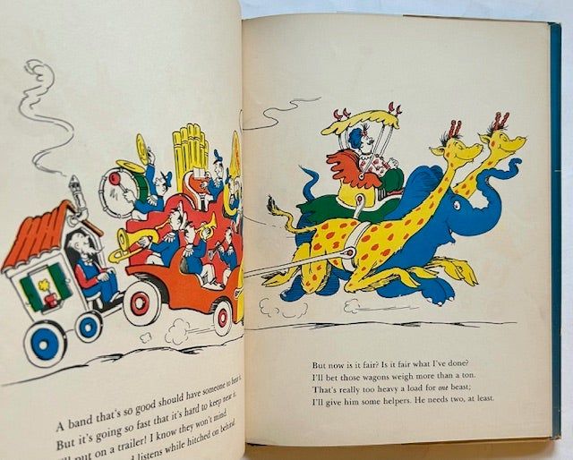 New York: Vanguard Press, 1937. Pictorial boards. Very Good/Very Good -. The 1937 true 1st edition, 1st issue of Dr. Seuss's first published children's book. With the essential issue points (as set forth by "Younger & Hirsch", pgs, 14-15) all present: 1) Marco's white shorts on both the book's and dustjacket's front covers; 2) The same date (1937) on both the title and copyright pages -- and with no other printings listed; 3) The "$1.00" price present on the dustjacket's lower front-flap. Fragile to be sure in its economically-made boards and paper but genuinely uncommon --now almost even historic-- in its earliest incarnation. In spite of the imperfections, this remains a solid, presentable copy. Bright and VG in its pictorial boards, with very light staining along the lower-spine and the lower front board, and modest offsetting at the pastedowns and, less so, at the endsheets. Also includes a colorful, mid-sized former owner (probably child's) bookplate affixed to the verso of the front free endpaper. There is no writing or other markings to speak of internally. The pages continue to be very clean and crisp, the original hues in Dr. Seuss's wonderful illustrations still vibrant and strong. And in an attractive, VG- dustjacket, with a degree of chipping along the spine ends and tips, and one chip --the size of a quarter, at the front panel's top-edge just barely hitting on the word "THINK" in the title. A number of discreet closed tears as well, all of which, taken together, render this a VG- dustjacket. But a dustjacket still not without its charm and still imbued with a good amount of visual appeal. Remarkably, "Mulberry Street" made the infamous list --issued in 2021, some 84 years after the book's original publication-- of the 6 banned Dr. Seuss titles, only making the original text even more sacred to most people who prize history and proportion.