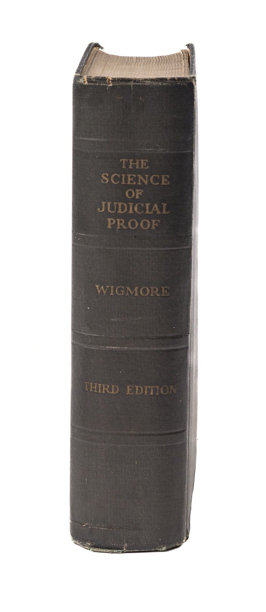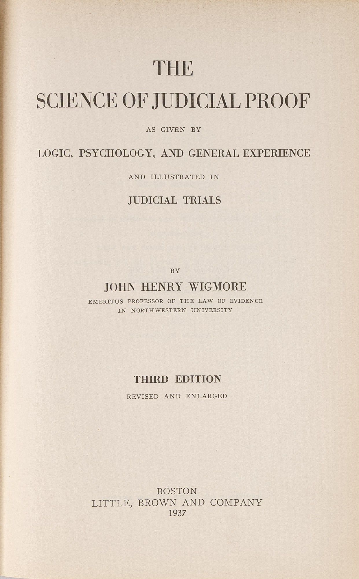 1937. Boston, 1937. Third edition, revised and enlarged.. Boston, 1937. Third edition, revised and enlarged. "Absolutely the Last Word on the Matter of Judicial Proof" Wigmore, John Henry [1863-1943]. The Science of Judicial Proof As Given by Logic, Psychology, And General Experience and Illustrated in Judicial Trials. Boston: Little, Brown and Company, 1937. xxiii, 1065 pp. with two folding plates, and nine illustrations. Publisher's green cloth hardcover, light shelfwear. Small circular embossed property stamp "Library of Anthony B Tohill" to front free endpaper, interior otherwise fresh. A very good copy. $350. * Third edition, revised and enlarged. An extensively revised and expanded edition of The Principles of Judicial Proof (1913), "[i]t is absolutely the last word on the matter of judicial proof and can be used to great value, not only by all practicing lawyers, but as an additional help to those more advanced in the profession.": Lawyer and Banker 24:242. Wigmore argued that the process of proving a case in court should be understood through the lens of logic and psychological principles, essentially outlining how evidence should be presented and evaluated in a trial based on human reasoning and perception. His theory emphasizes how judges and juries analyze evidence presented in court by applying logical reasoning and considering psychological factors that influence how people perceive and interpret information. This concept draws on formal logic to evaluate the consistency and coherence of evidence, ensuring that the facts presented form a logical chain leading to a conclusion. Wigmore recognized the psychological aspects of decision-making in the courtroom, including factors like witness credibility, juror bias, and the impact of persuasive techniques.
