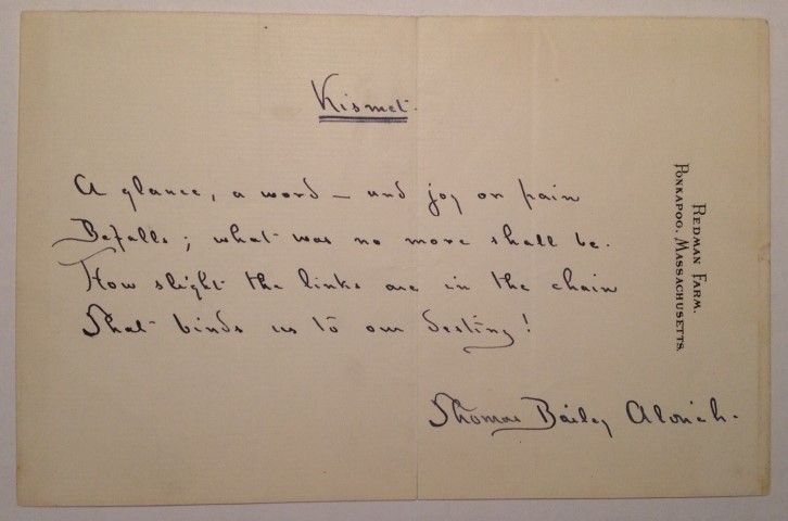 Ponkapog, 1880. unbound. 1 page, 5 x 7.5 inches, Ponkapog, Massachusetts, no date, circa 1880. A four-line poem entitled "Kismet," written on personal stationery and signed in full, in part: "A glance, a word and joy or pain Befalls; what was no more shall be..." Several folds; very good condition.