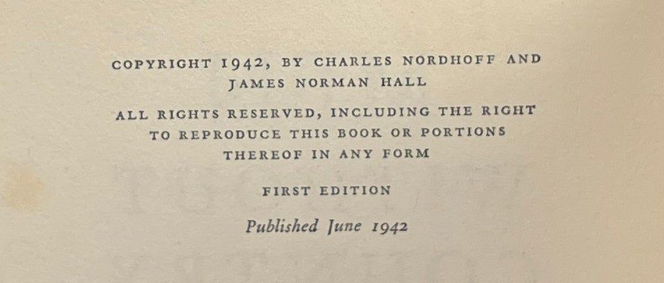 Boston: Little, Brown & Co, 1941. First Edition. Hardcover. Near Fine/Very Good. An Atlantic Monthly Press book. Near Fine in a Very Good jacket, clipped, faded at the spine. Blue cloth with blue ink lettering on the spine and front board. Square and firmly bound, foxed at the edges and endpapers, clean otherwise. From the authors of Mutiny on the Bounty, a novel about the conflict between five escaped convicts from French Guiana and two security guards loyal to the Vichy regime. Adapted into the film Passage to Marseille, starring Humphrey Bogart.