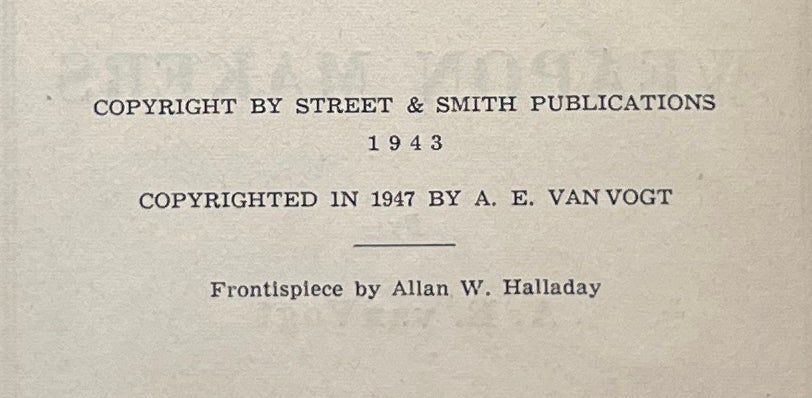 Providence: Hadley Publishing Company, 1949. First Edition. Hardcover. Fine/Fine. About Fine in a Near Fine jacket, unclipped ($3.00), lightly rubbed, faded a shade at the spine. Maroon boards with gilt lettering on the spine. Square and firmly bound, former owner's stamp inside the front board and on the front endpapers, clean otherwise. van Vogt's continuation of The Weapon Shops of Isher, seeing Robert Hedrock struggle between Empress Innelda and the Weapon Shops.