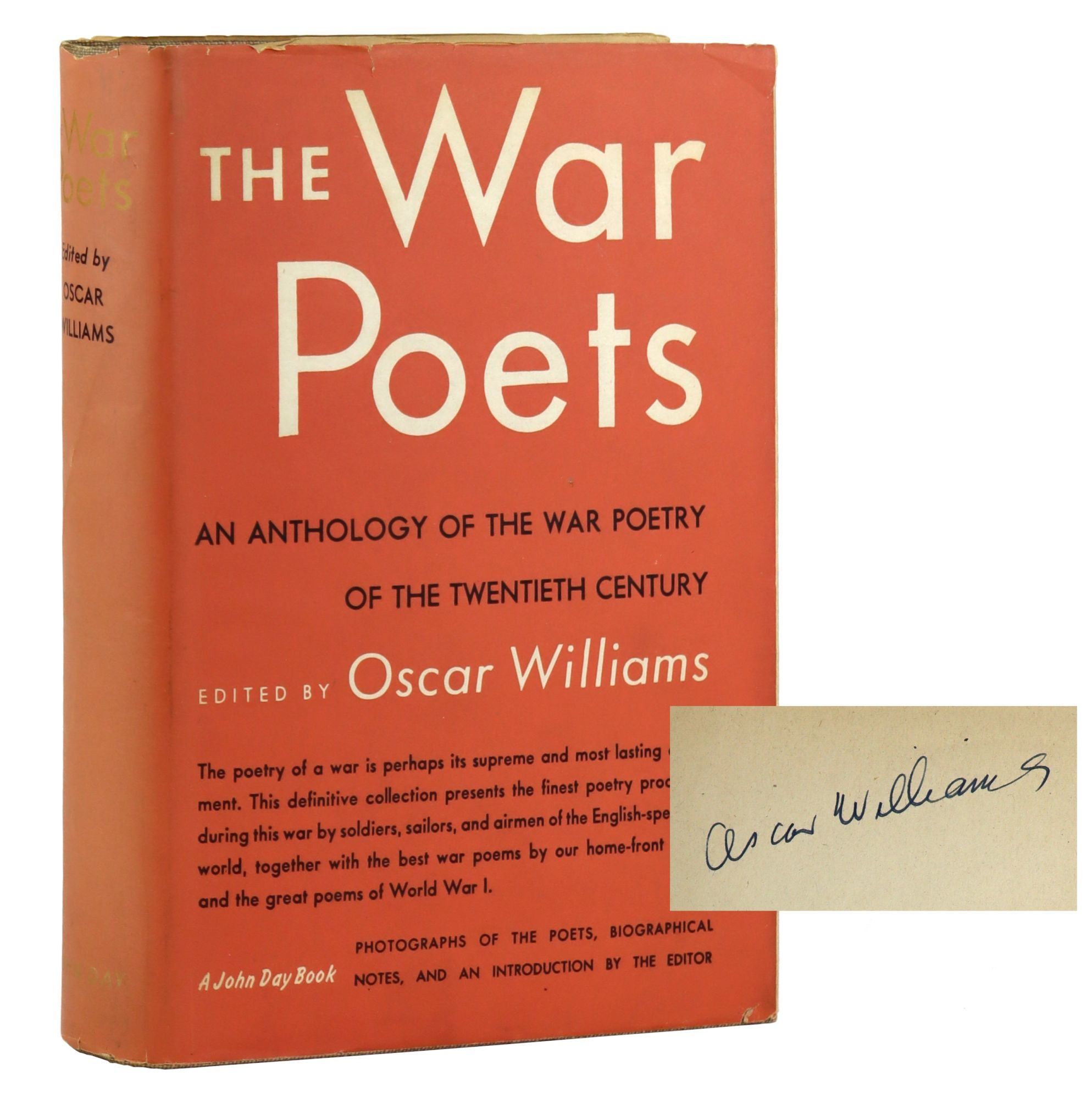 New York: The John Day Company, 1945. Very Good/Very Good. New York: The John Day Company, 1945. First Edition. Signed by editor Oscar Williams on front free endpaper. Octavo (22cm). Dust jacket with $5.00 price intact. Publisher's cloth binding. Orange topstain. 485 pp.; including sixteen pages of black and white photographs of the poets.
