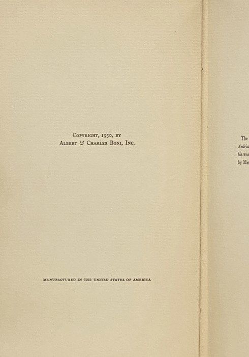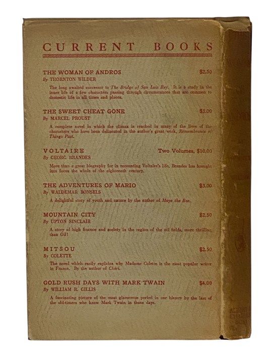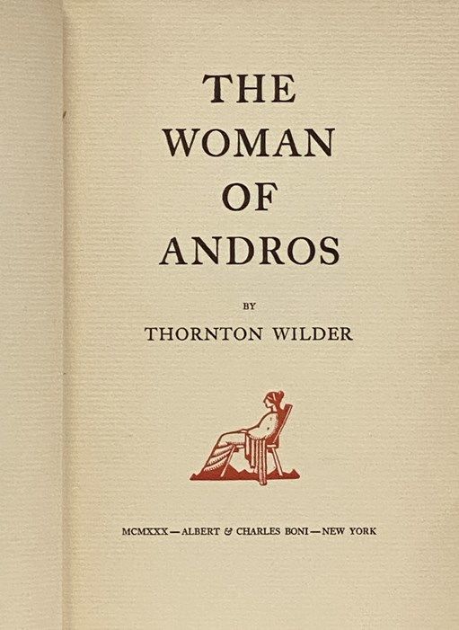 New York: Albert & Charles Boni, 1930. First Edition. Hard Cover. Very Good/Good. 7x4x1. First edition. Ink name on front endpaper, jacket edges rubbed with minor loss from corners, spine and boards toned, jacket toned. 1930 Hard Cover. 162 pp. Thornton Wilder was a Pulitzer Prize winning American playwright and novelist best known for The Bridge of San Luis Rey and Our Town. The Woman of Andros, set before the birth of Christ on an obscure Greek island, tells the story of the enigmatic Chrysis, a courtesan (and an outcast) of haunting beauty and intelligence. In her gatherings with the young men of the island, Chrysis probes what is precious about life and how we live, love, and die in a harsh world, themes that Wilder revisited eight years later in his play, Our Town. Pamphilus, the only son of a prominent villager, fathers a baby out of wedlock with Chrysis's sister, whom he wants to marry. The questions faced by Pamphilus, his family, and the other "respectable" citizens of the island also explore themes of social class and status.
