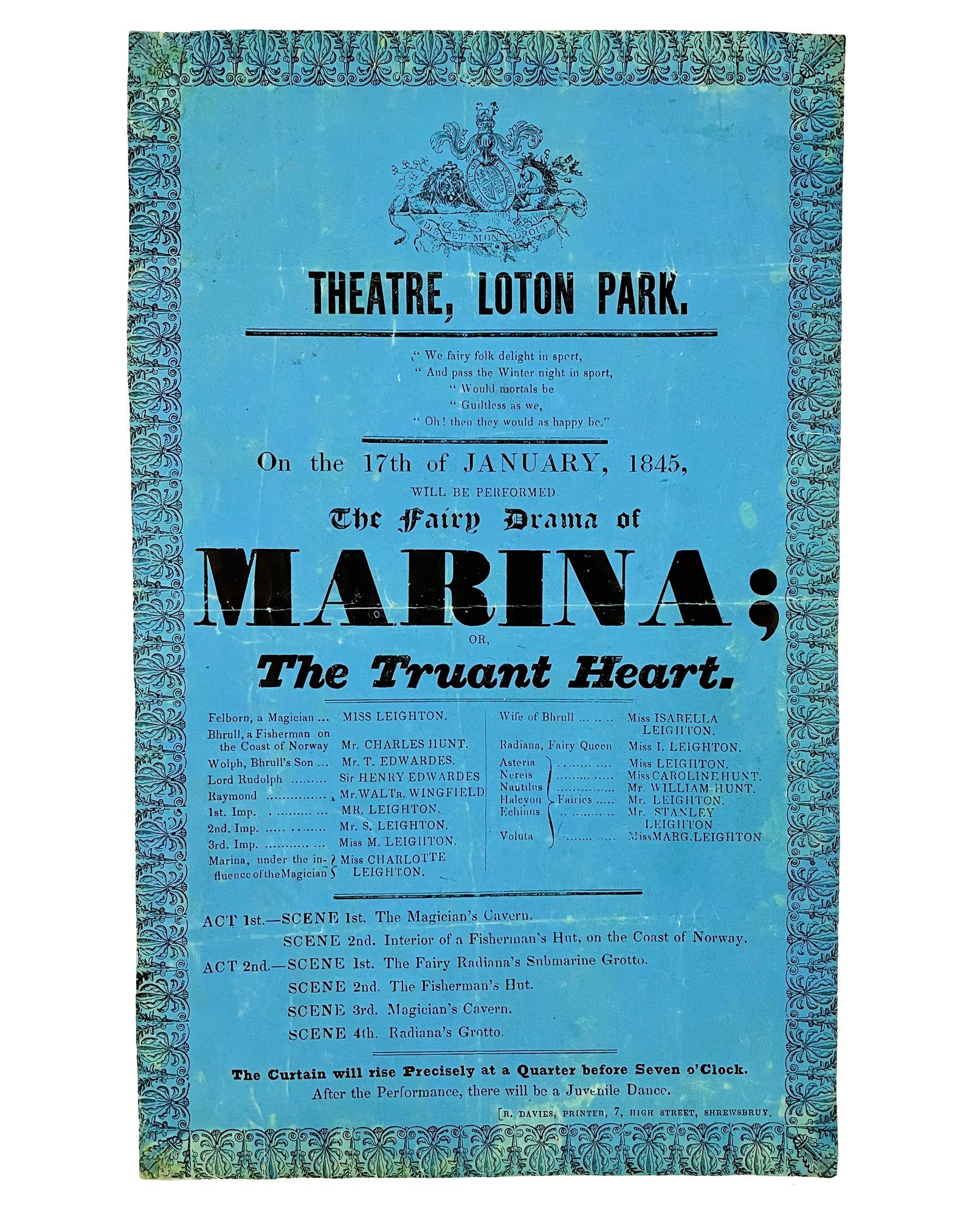 Loton Park, Shropshire: R. Davies, Printer, 7 High Street, Shrewsbury, 1845. Privately printed playbill for a Victorian theatrical performed by the children of Loton Park, the ancient Shropshire seat of the Leighton family, on January 17, 1845. The performance of “The Fairy Drama of Marina; or, The Truant Heart” was the opening entertainment of an evening hosted by Baldwin Leighton, 7th Baronet (1805-1871); the title role of Marina was played by his daughter Charlotte, then ten years old. The cast was composed of a group of Leighton children and their friends, who were treated to “a juvenile dance” after the curtain fell. Although we have been unable to find any trace of the play, which features the magician Felborn, the fisherman Bhrull, and Radiana the Fairy Queen, the lyric quoted at the head of the playbill is drawn from composer William Hawes’s popular tune, “We Fairy Folk Delight in Sport.” Playbills from private theatricals are extremely scarce. A wonderful survival. Broadside, measuring 12.25 x 7.5 inches, printed in bright blue and black. Decorative border, with royal arms at head of sheet. Light rubbing, central crease from folding. Matted to 17 x 11.5 inches.