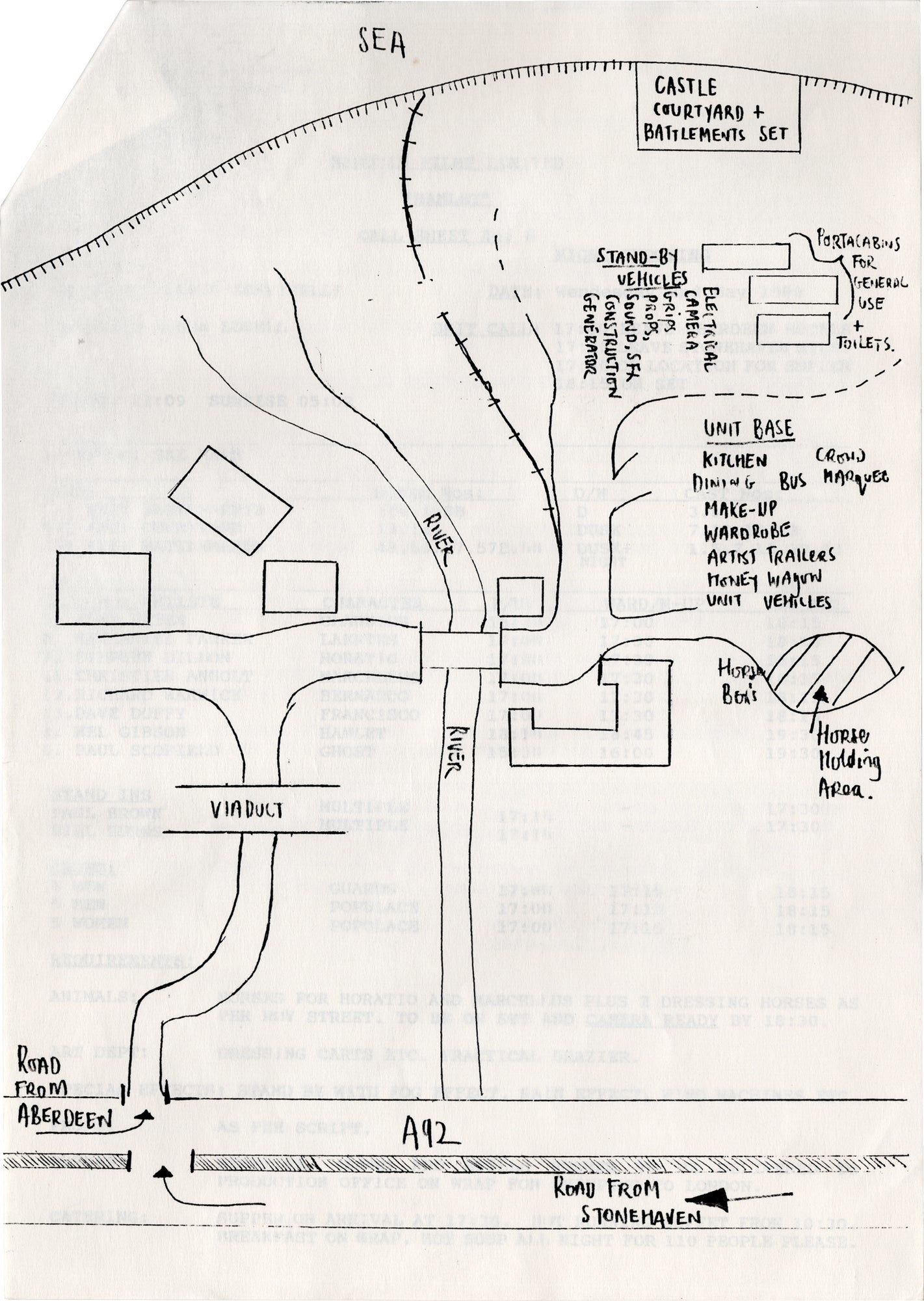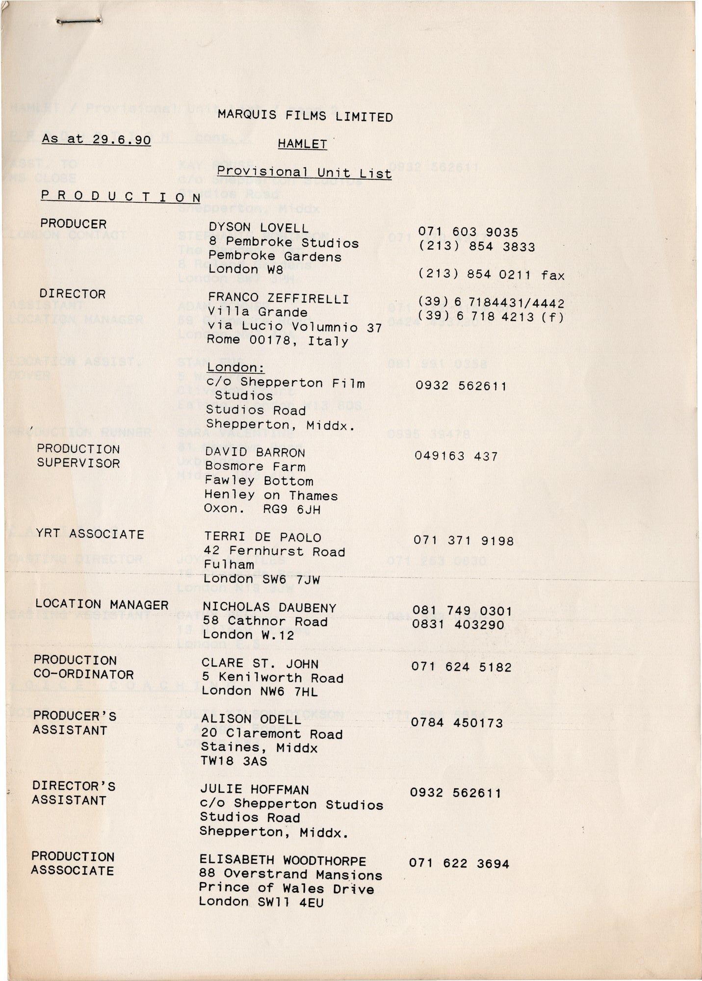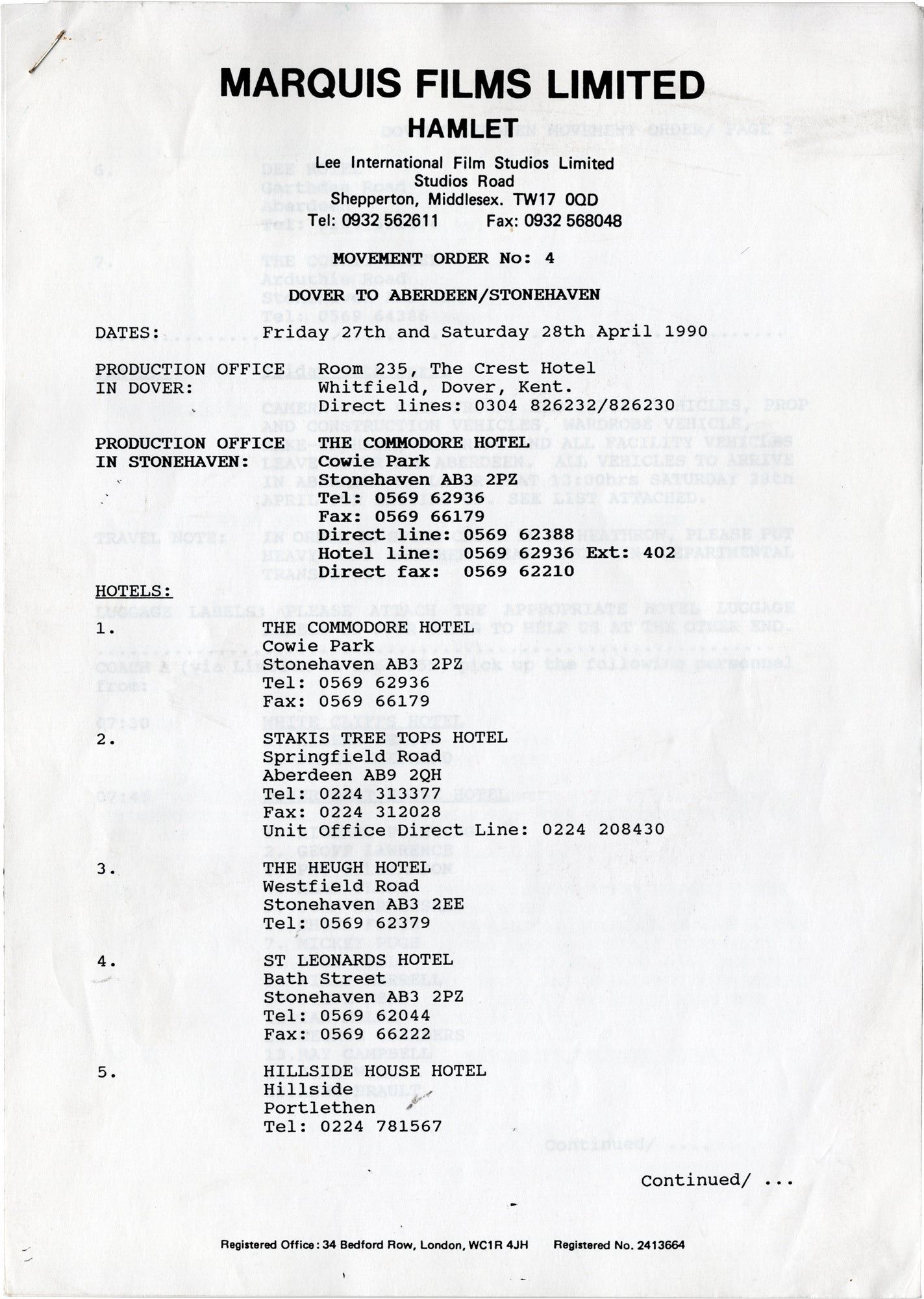 N.p.: N.p., 1990. Small archive of production documents for the 1990 film, including six gatherings of Call Sheets, two to ten pages each, dating from "24th April 1990" to "6th May 1990," a sixteen page "Movement Order No. 4" for "Friday 27th and Saturday 28th April 1990," and a twenty-five page "Provisional Unit List," dated "29.6.90." The call sheets and "Movement Order" found here were made during location shooting in Dover and Aberdeen/Stonehaven, and include the daily schedule for cast and crew, as well as locations and maps to the day's shooting location. Earliest Call Sheet, dating "24th April 1990," with a single manuscript ink annotation of copy number "308" in the top margin.