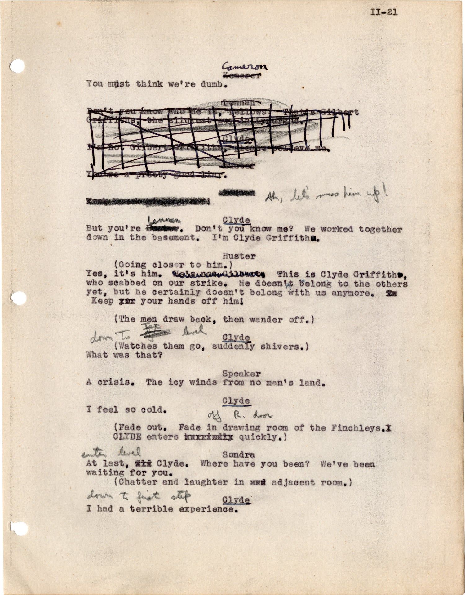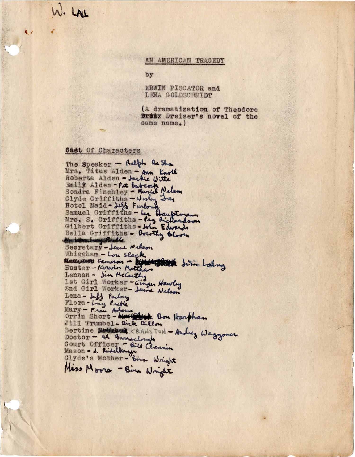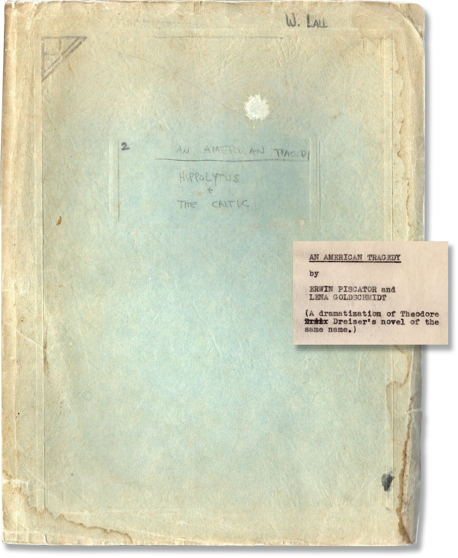 N.p.: N.p., 1948. Carbon typescript copy of the play, "An American Tragedy," with spirit-duplication copies of the plays, "Hippolytus" and "The Critic" bound in. Working copies belonging to actor Wesley Lau, with pencil annotations of Lau's name and the plays' titles on the front wrapper, and manuscript marker annotations of "W. Lau" on the top left of the title page as well as listed in the annotations of actors' names adjacent to the character list on the title page, with manuscript pencil and marker annotations throughout all three by Lau.