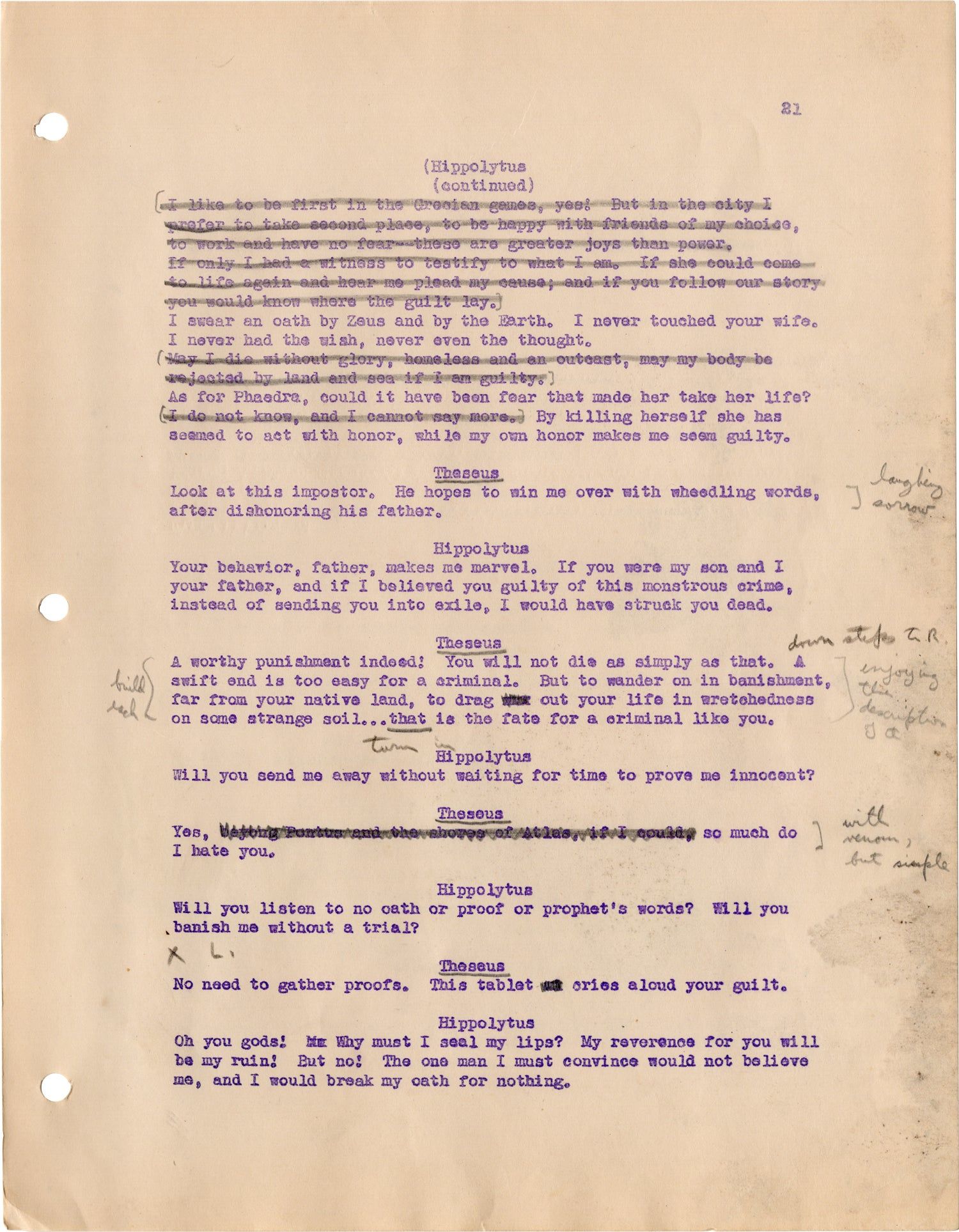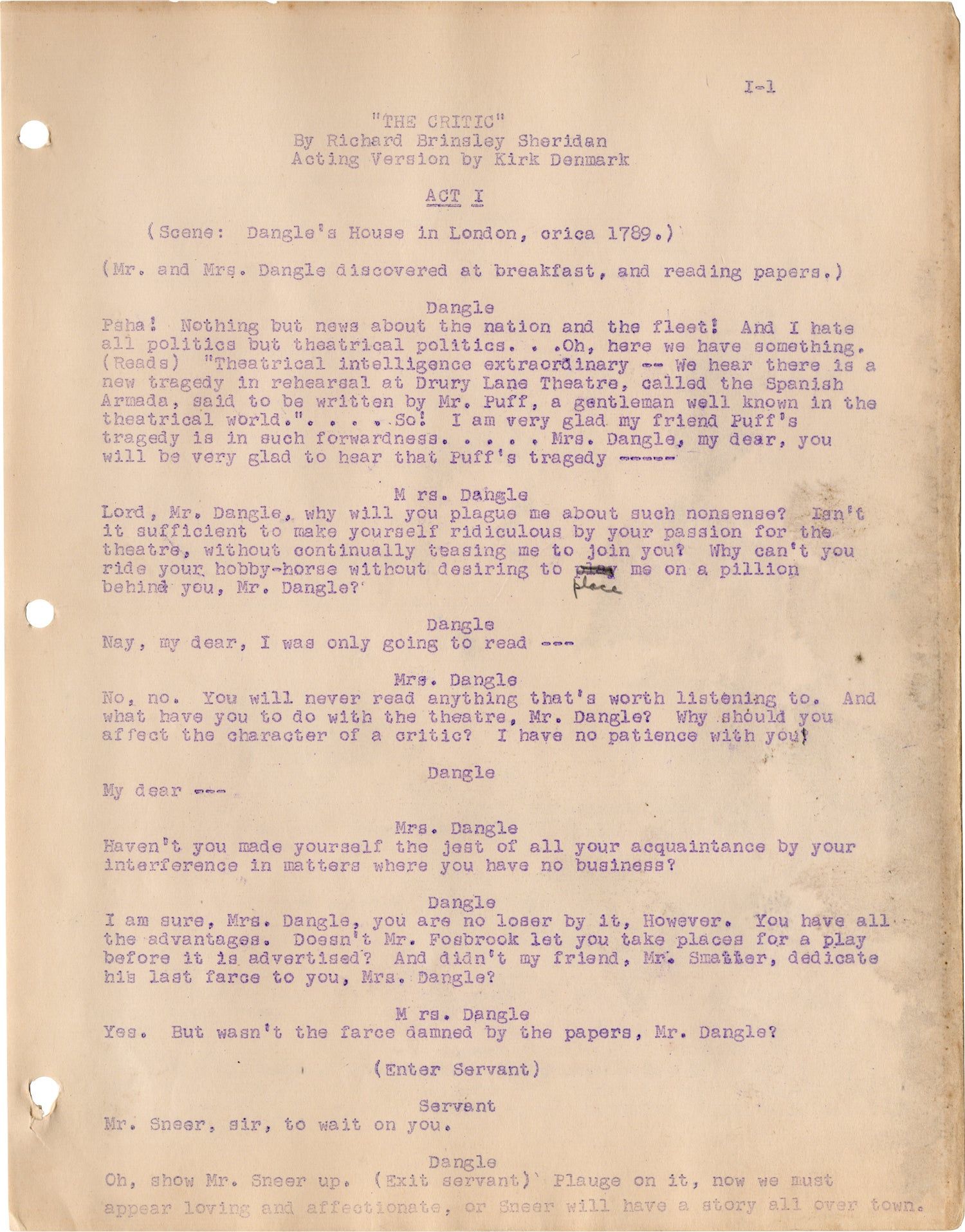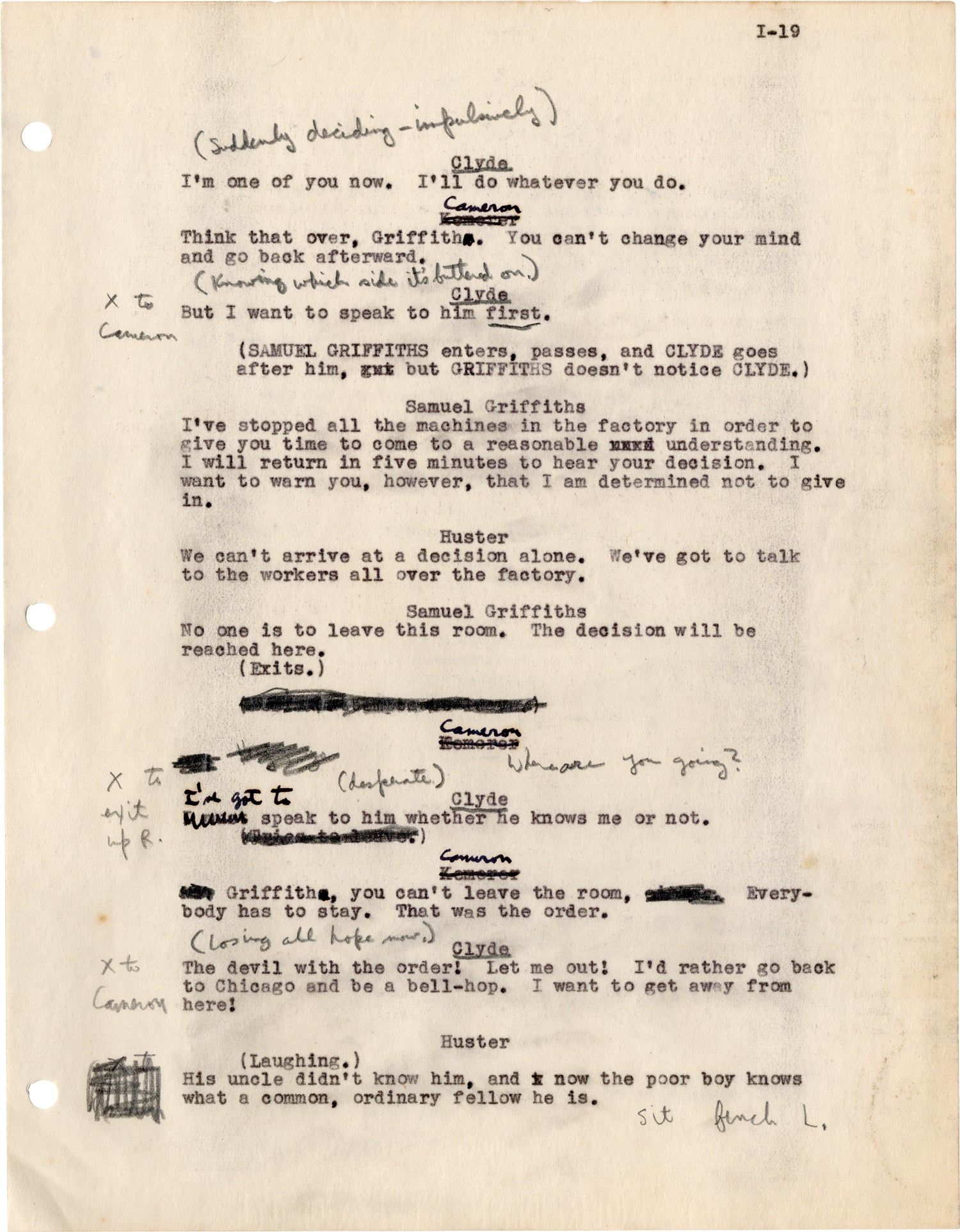 The working copy of the three plays found here are all from July 1948 Beloit College (Beloit, Wisconsin) performances of the three plays, which Lau, while on summer vacation from Yale Drama School, performed in during the college's summer theatre workshop. Lau played the lead, Claude Griffiths, in Erwin Piscator and Lena Goldschmidt's 1932 adaptation of the the 1925 Theodore Dreiser novel, Theseus in Euripide's "Hippolytus," and Plagiary in the 1779 satire "The Critic" by Richard Brinsley Sheridan (noted as "acting version" by Beloit College theatre director and designer Kirk Denmark).