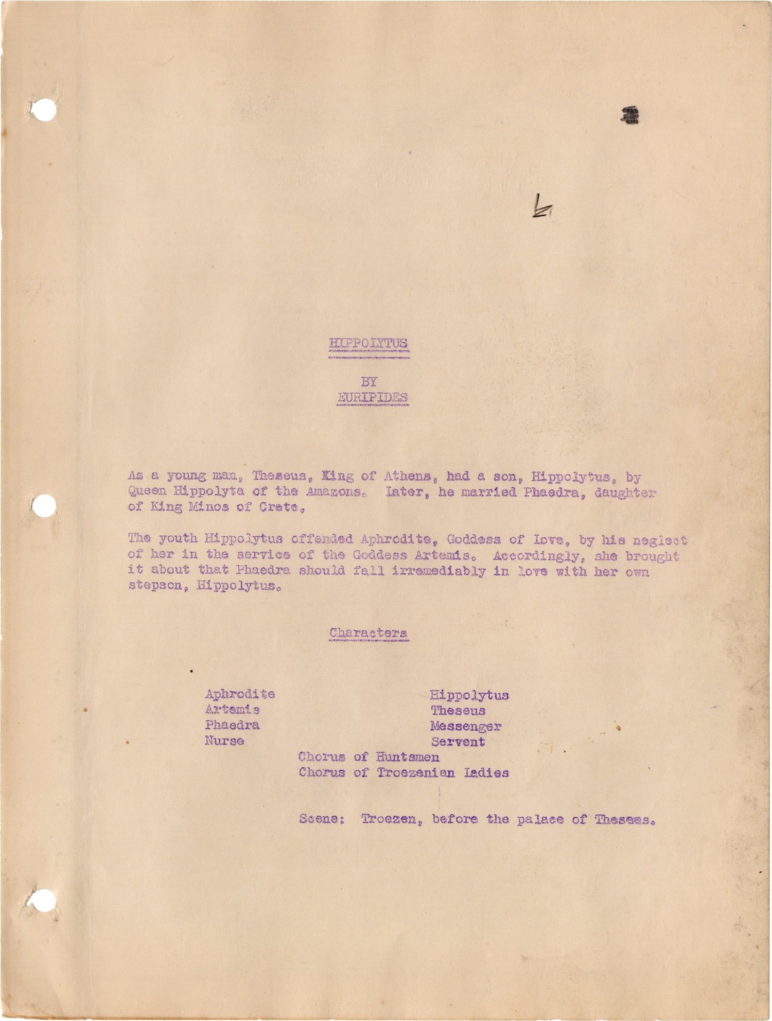 Bound in following "An American Tragedy." Title page present, with credits for playwright Euripides. 30 leaves, with last page of text numbered 29. Spirit duplication, rectos only. Pages Near Fine overall.