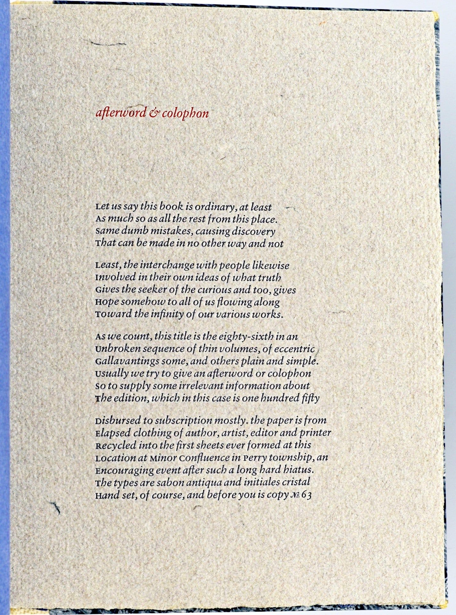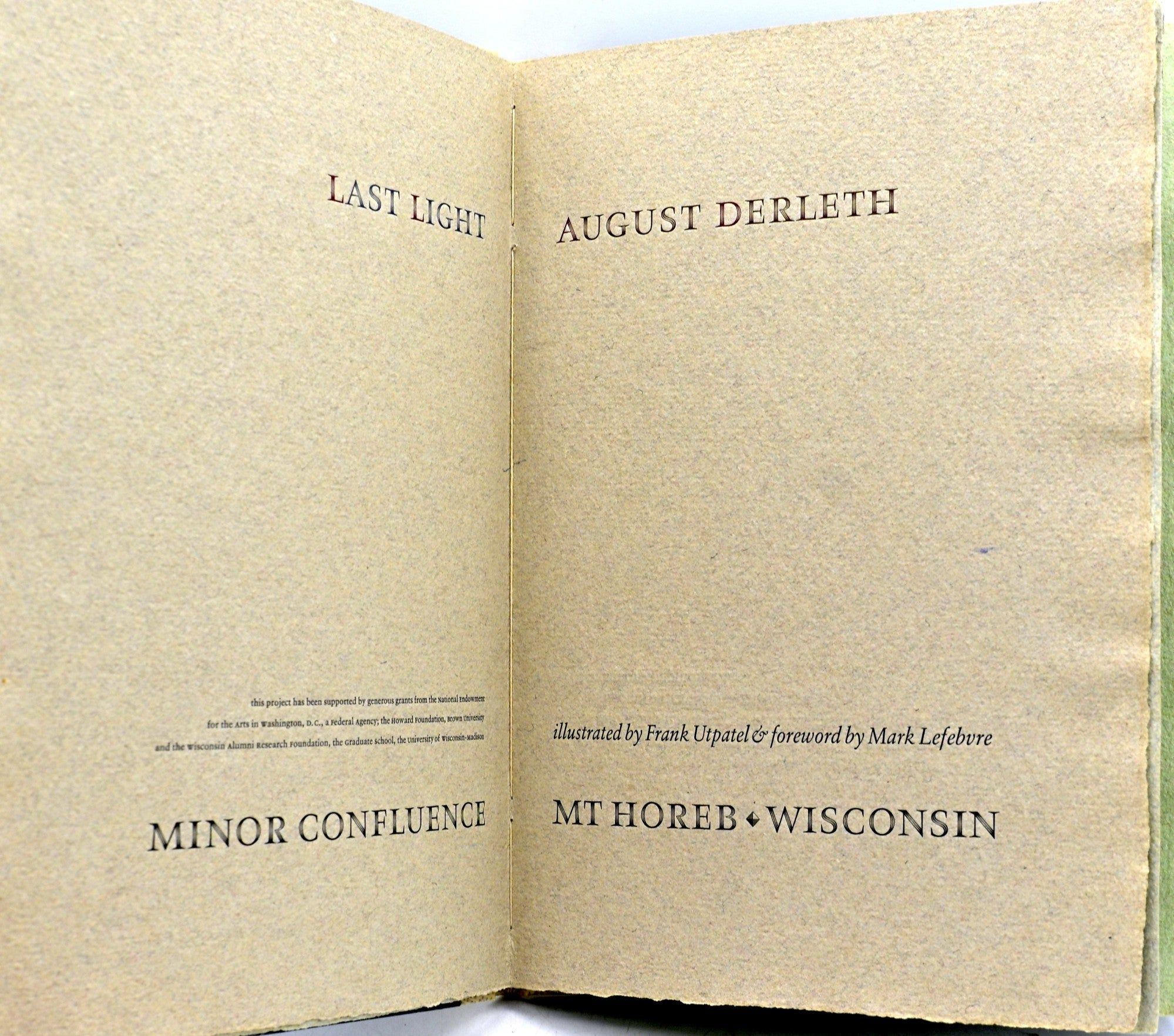 Mt. Horeb: The Perishable Press, 1978. Limited Edition. Hard Cover. Near Fine binding. Frank Uptel. Octavo; quarter bound in vellum over hand marbled paper covered boards; [23] pages; with woodcut engravings by Frank Uptel.~~Last Light is a collection of poems by August Derleth which was discovered 5 years after his death and published posthumously by The Perishable Press. It marks the final collaboration between Mr.Derleth and his good friend and collaborator Frank Uptel who created the woodcut engravings for this title. ~~Printed on hand made paper “from Elapsed clothing of author, artist, editor and printer Recycled into the First sheets ever formed at this location at location at Minor Confluence in Perry Township.” - From the colophon.~~This book is limited to 150 of which this is number 63. Near Fine binding.