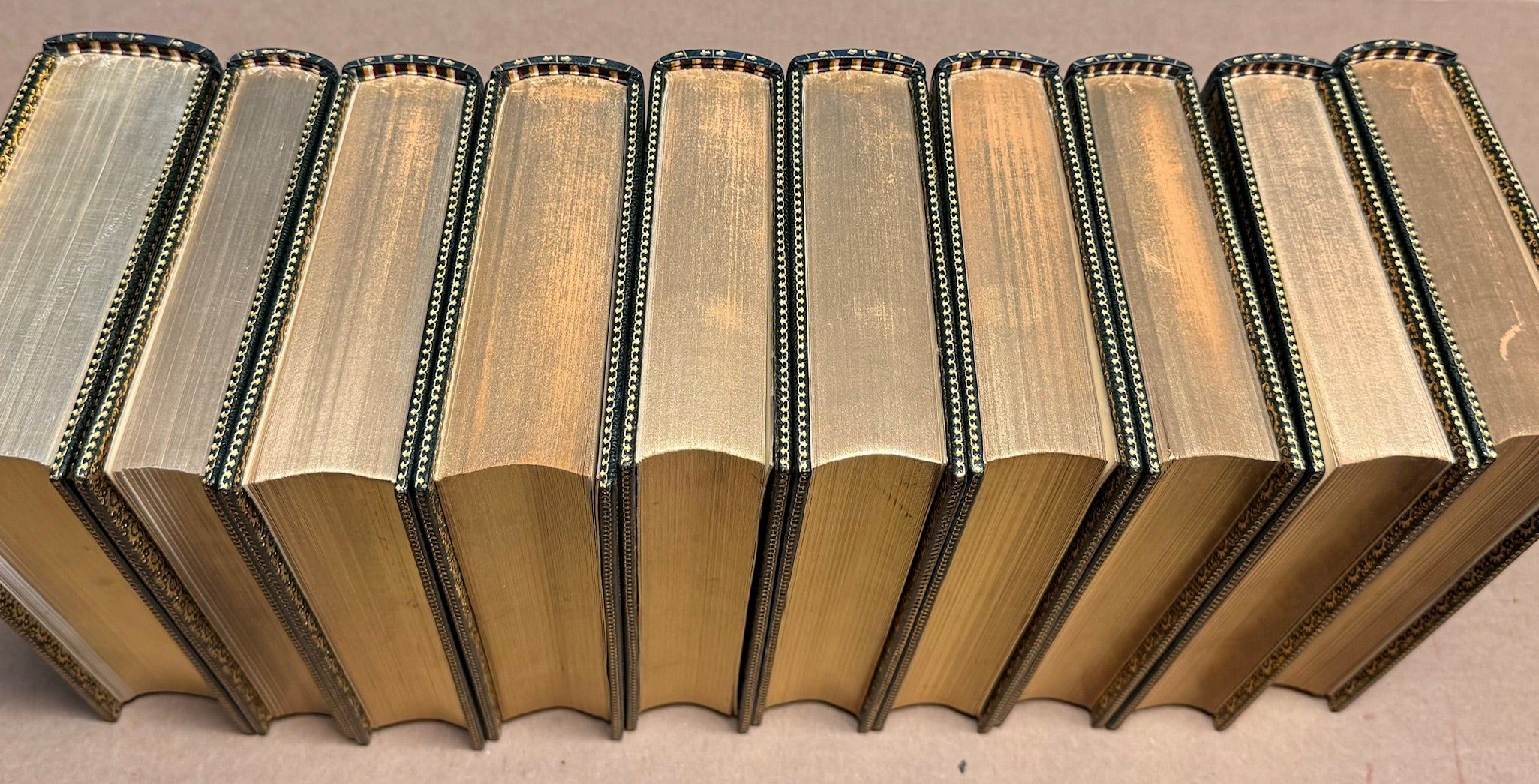 Stratford-on-Avon: Shakespeare Head Press, 1908. hardcover. fine. 10 volumes. 8vo, beautifully bound by Zaehnsdorf in full contemporary green morocco; ornately gilt-decorated spines and covers; inner & outer gilt dentelles, all edges gilt, pearlescent silk moire endpapers. Stratford-on-Avon: Shakespeare Head Press, 1908. Gilt on page edges lightly scuffed, still a fine set in a lovely binding.