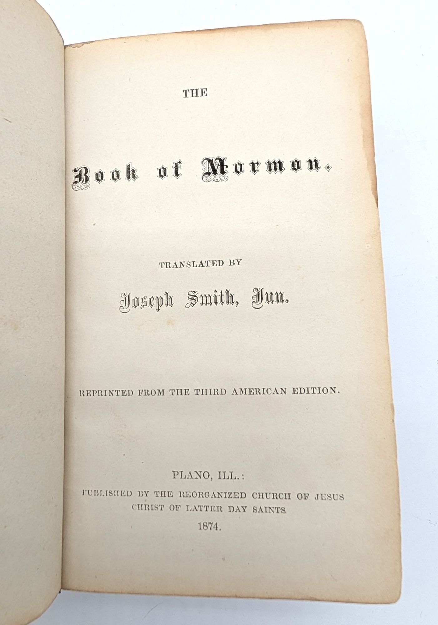 An early Plano edition published by the Reorganized Church of Jesus Christ of Latter Day Saints. This copy does not have a red border on the title page. The Flake entry (#611) for the Plano edition published in 1874 states, "The first edition published by the Reorganized Church of Jesus Christ of Latter Day Saints. It is not a reprint from the third American edition as the title indicates but follows the Liverpool stereotyped edition of 1852. UPB copy has title page within red border. Some have suggested that the red border indicates the first printing." Flake entry 614a states, "1878. (same as 1874 edition) Plano, Ill., Published by the Reorganized Church of Jesus Christ of Latter Day Saints, 1874 [1878?] ... Title page without red border." Therefore, using the Flake citations as a guide, this copy is most likely an 1878 edition.