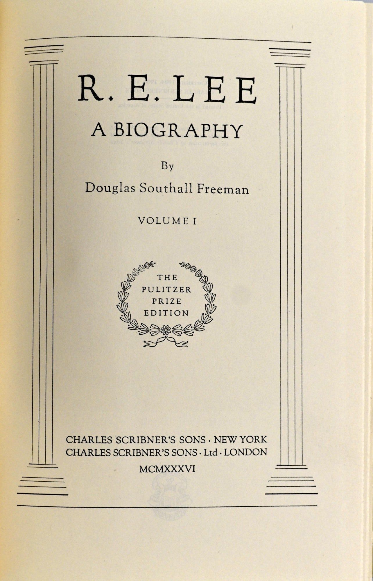 New York: Charles Scribner’s Sons, 1936. Hard Cover. Fine binding/Near Fine dust jacket. Four large octavo volumes; in the publisher’s blue-gray leatherette, with titles and decorations in gilt to the spines; and with dustjackets and the publisher’s slipcase with printed label to the top edge.~~This edition of R. E. Lee was printed in 1936, after the award of the Pulitzer Prize for this work. Both the slipcase and the dusjtackets are quite rare and are seldom seen in the marketplace.~~Howes F-350; Harwell, ITC,,62; Nevins I30; Eicher 971.~ (Howes F-350; Harwell, ITC,,62; Nevins I30; Eicher 971.). Fine binding / Near Fine dust jacket.