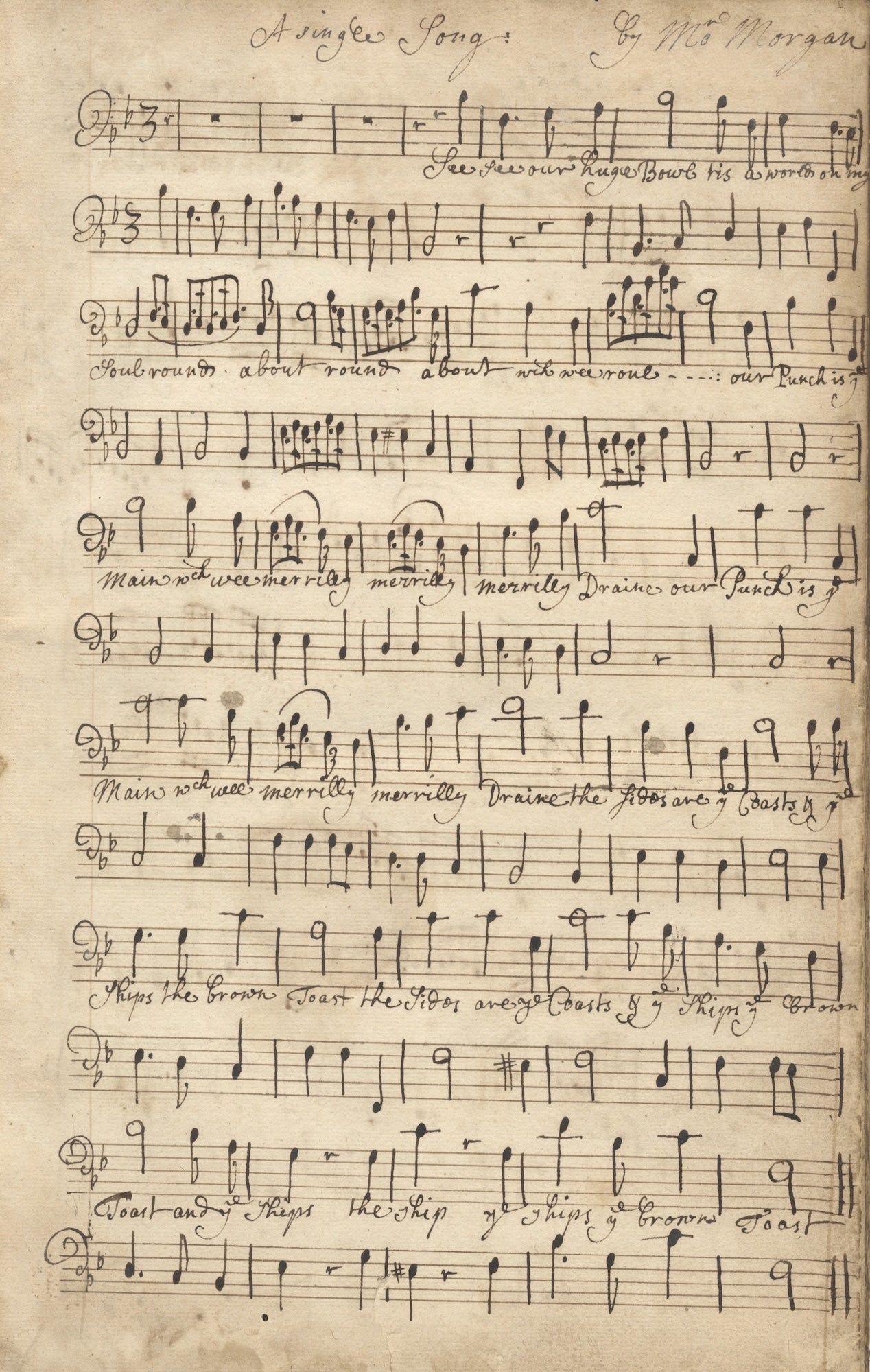 "A single Song," with text commencing "See, see our huge bowl." 3 pp. in total. Scored for bass voice and unfigured basso continuo. A drinking song with some melodic and harmonic similarity to the famous "Anacreontic Song." The present song, with a bounding melody in 3/4, incorporates divisions of running 16th and dotted rhythms. Unlocated.