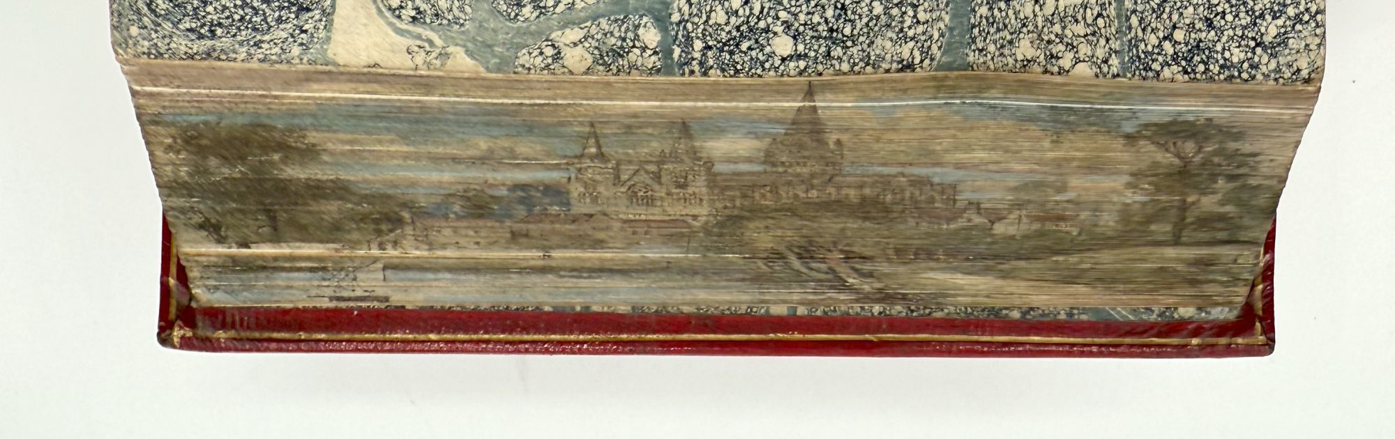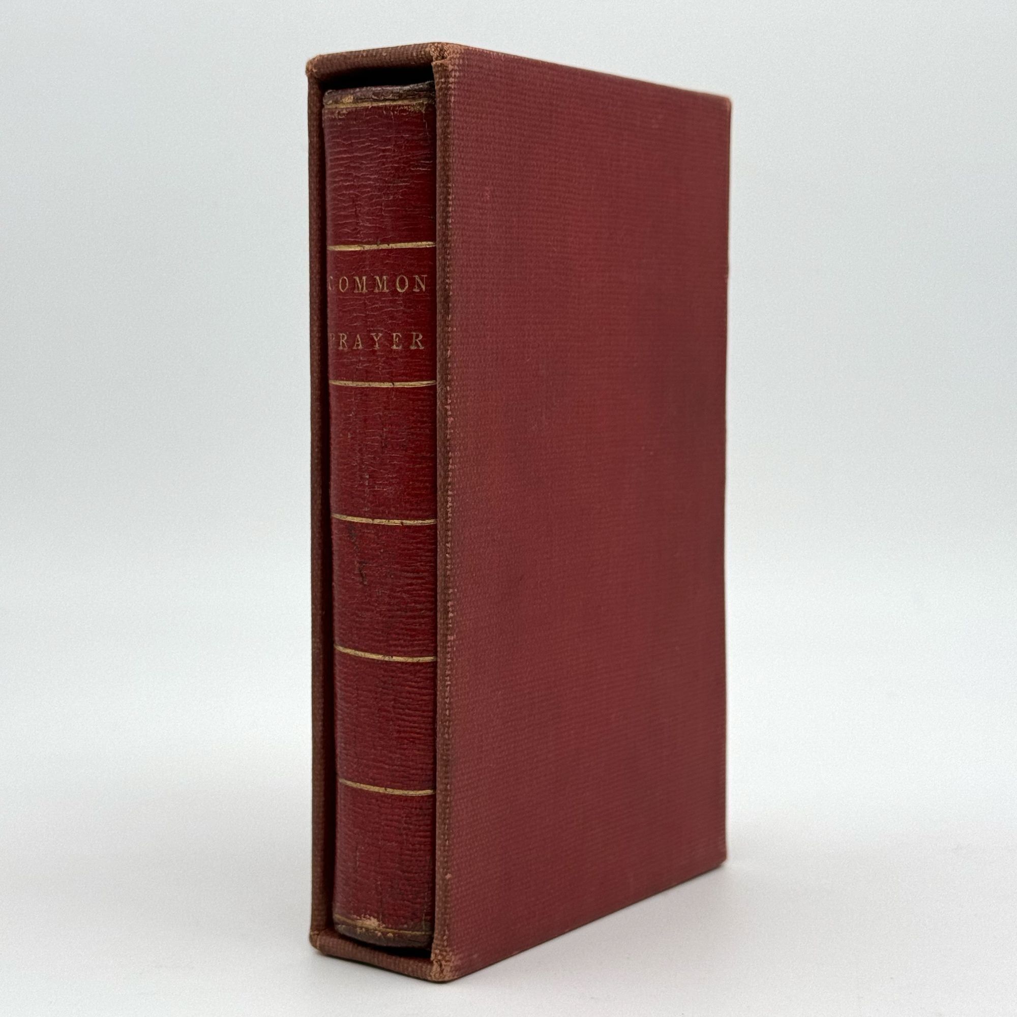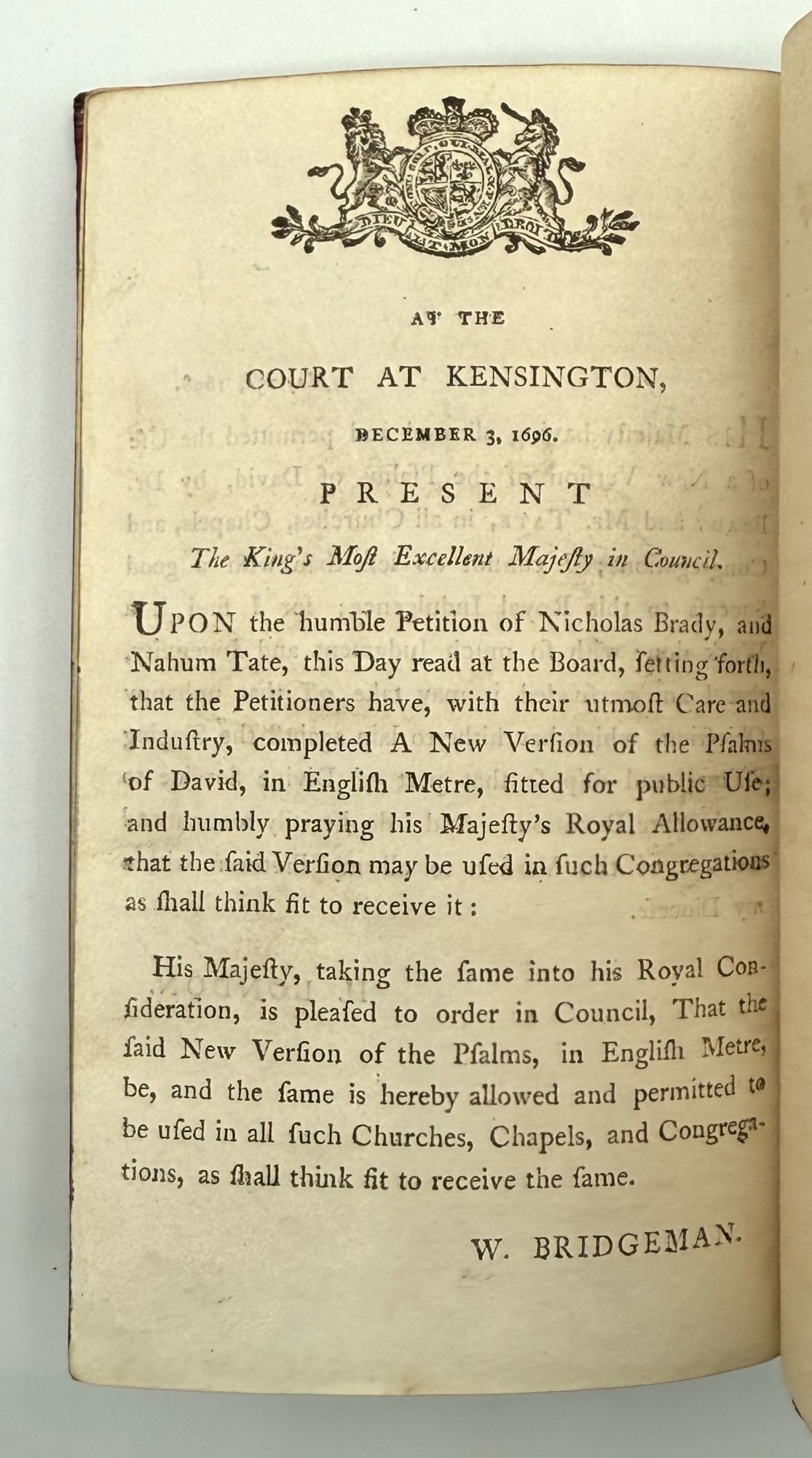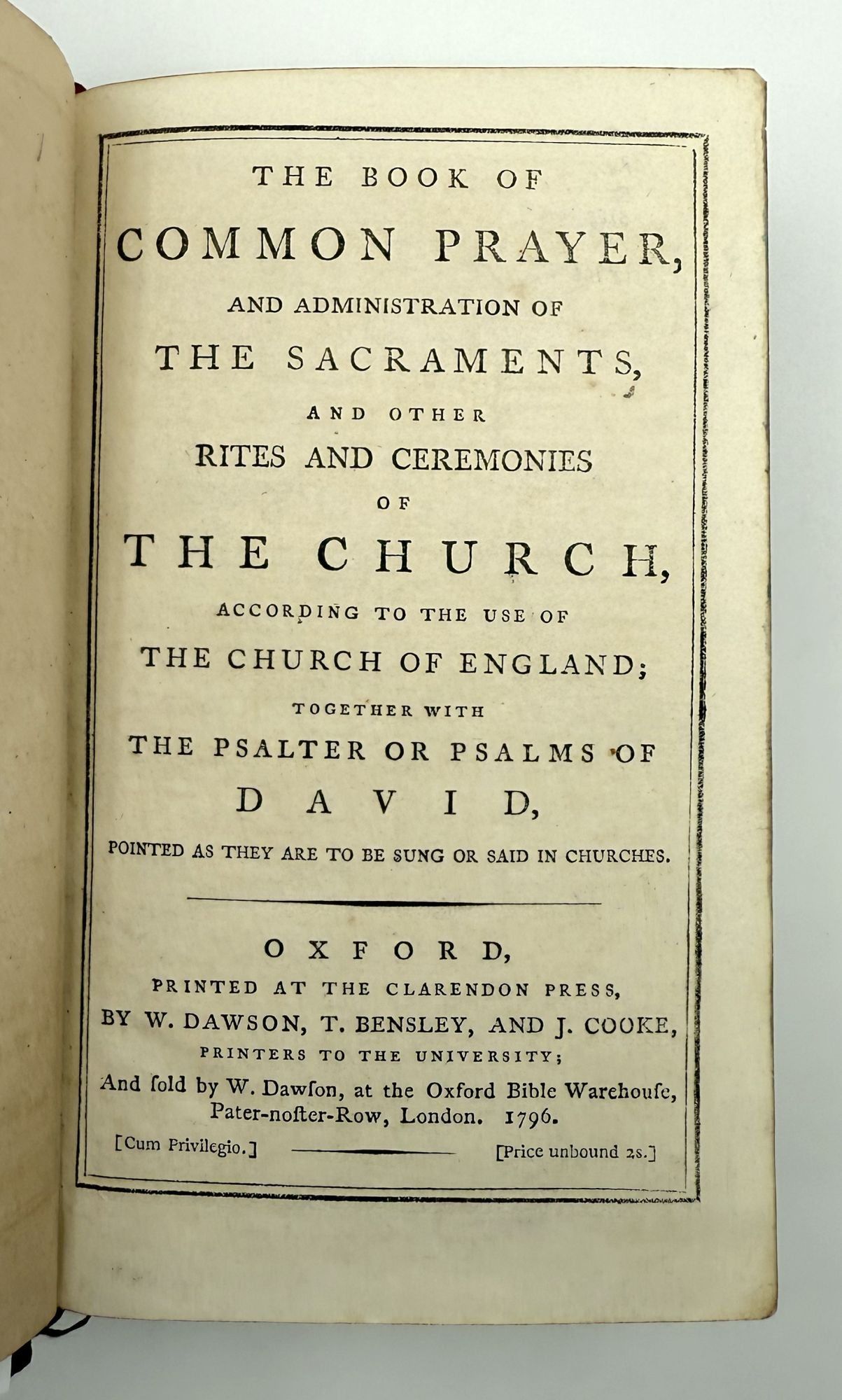 Oxford: Clarendon Press, by W. Dawson, T. Bensley, and J. Cooke, printers to the University, 1796. 1 vols. 12mo. Red morocco, stamped in gilt on covers and spine. Marbled endpapers with gilt-stamped morocco bookplate. Corners bumped. All edges gilt with double fore-edge painting of Lichfield and Chichester Cathedrals. Marbled endpapers. Bound-in ribbon marker. In buckram slipcase. 1 vols. 12mo. A late 18th-century version containing no royal preamble from George III, but only two brief pages at the rear — dated 1698 and 1696, respectively — attesting to then-king William II's approval of the New Version of the Psalms of David by Nicholas Brady and Nathan Tate, also included here.