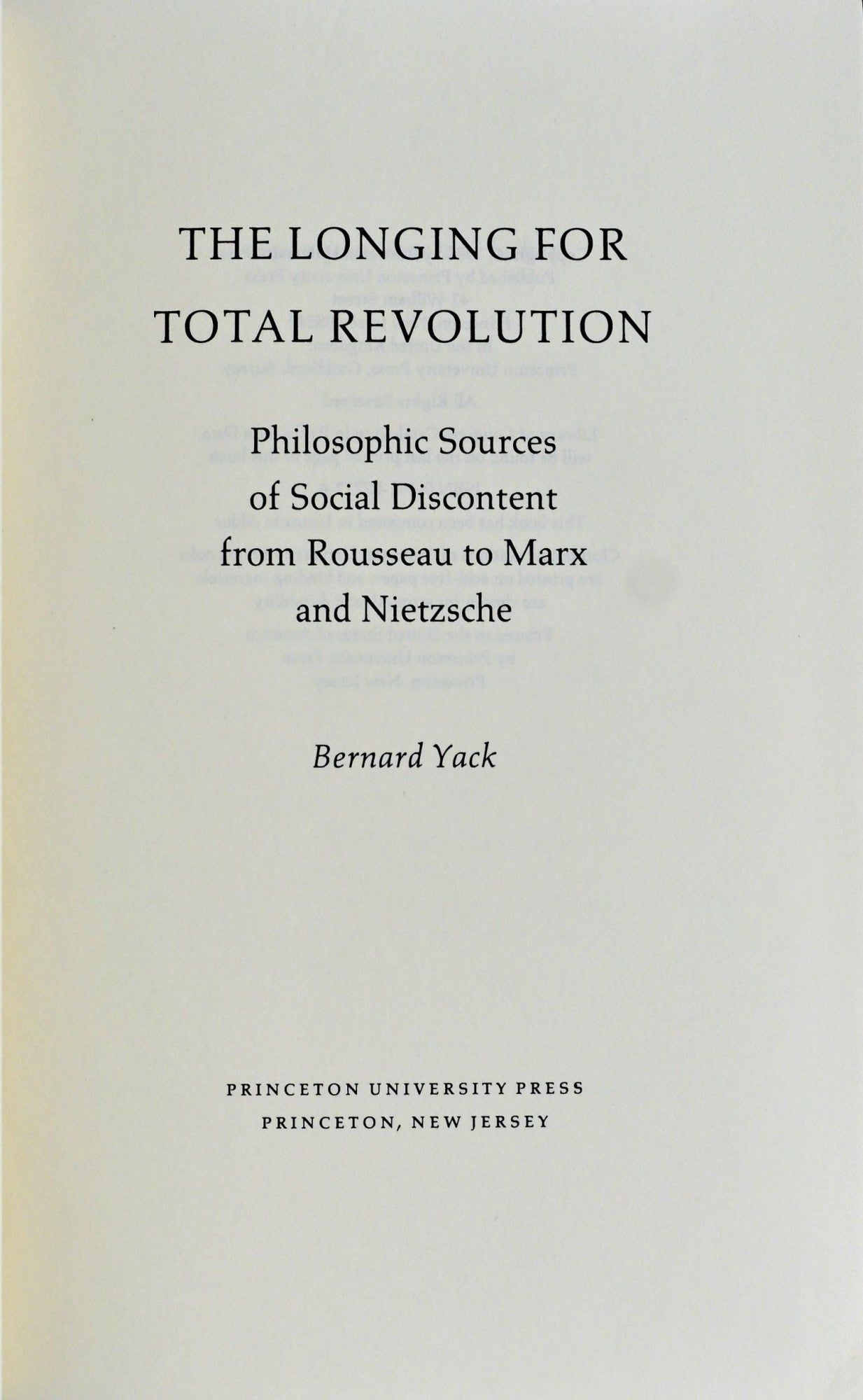 Princeton: Princeton University Press, 1986. First Edition. Near Fine binding/Near Fine dust jacket. Octavo; in the publisher’s black cloth binding; in an unclipped jacket; xvii, 390 pages including the Index; slight shelf wear to the jacket; pencil notes in the margins.~~From the front flap “This book is an attempt to understand an important feature of modern culture, which underlines the work and appeal of Marx, and in general, the thinkers who issue from the romantic period. Yack strongly challenges the usual interpretation of these thinkers in terms of ‘messianism.’ Hid work has powerful impact and will arouse a storm of controversy.” - Charles Taylor. Near Fine binding / Near Fine dust jacket.