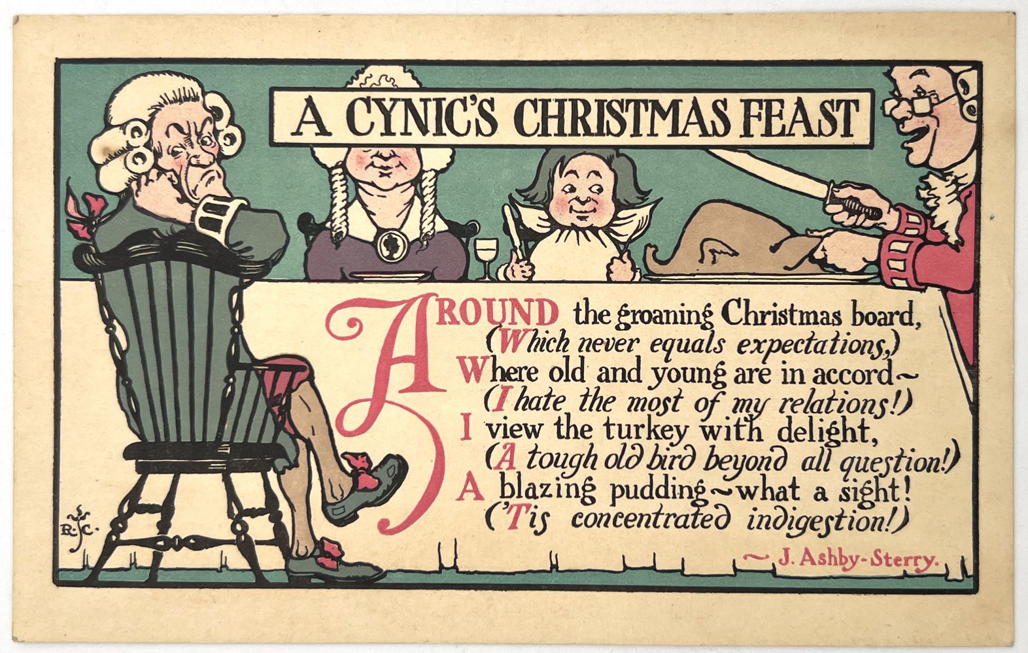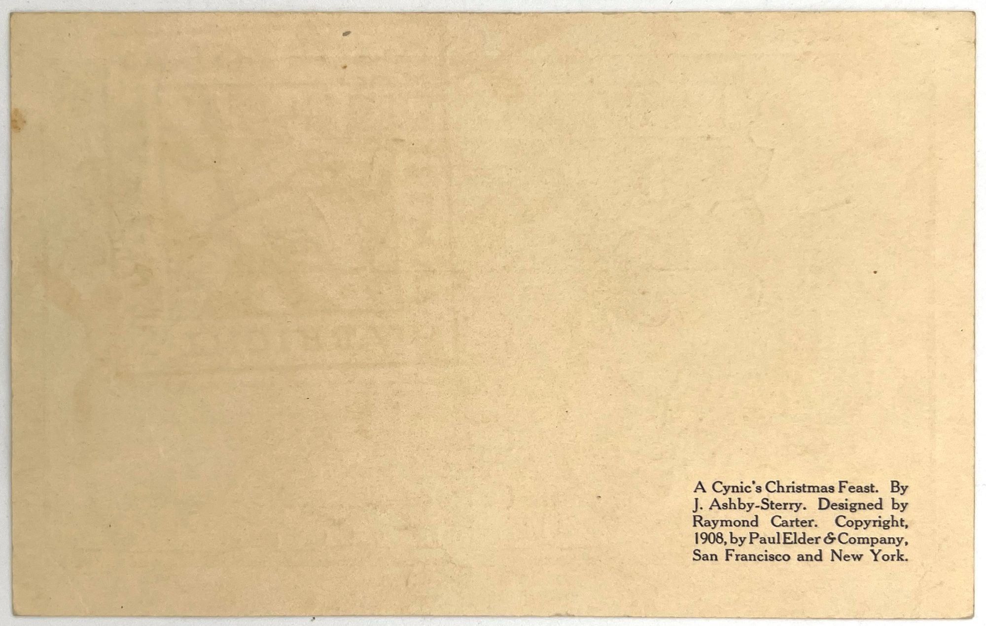 San Francisco and New York: Paul Elder & Company, 1908. Very good. Light toning.. A charming printed card, illustrating a humorous poem by the beloved contributor to Punch, J. Ashby-Sterry (1836-1917). The artist is signed "R.C.". The image shows a curmudgeonly old man in a powdered wig, grimacing as a smiling man carves a turkey. The poem shows the happy thoughts of his relatives interspersed with his own cynical thoughts about the spread. Measures approx. 4.25" by 7" Around the groaning Christmas board,