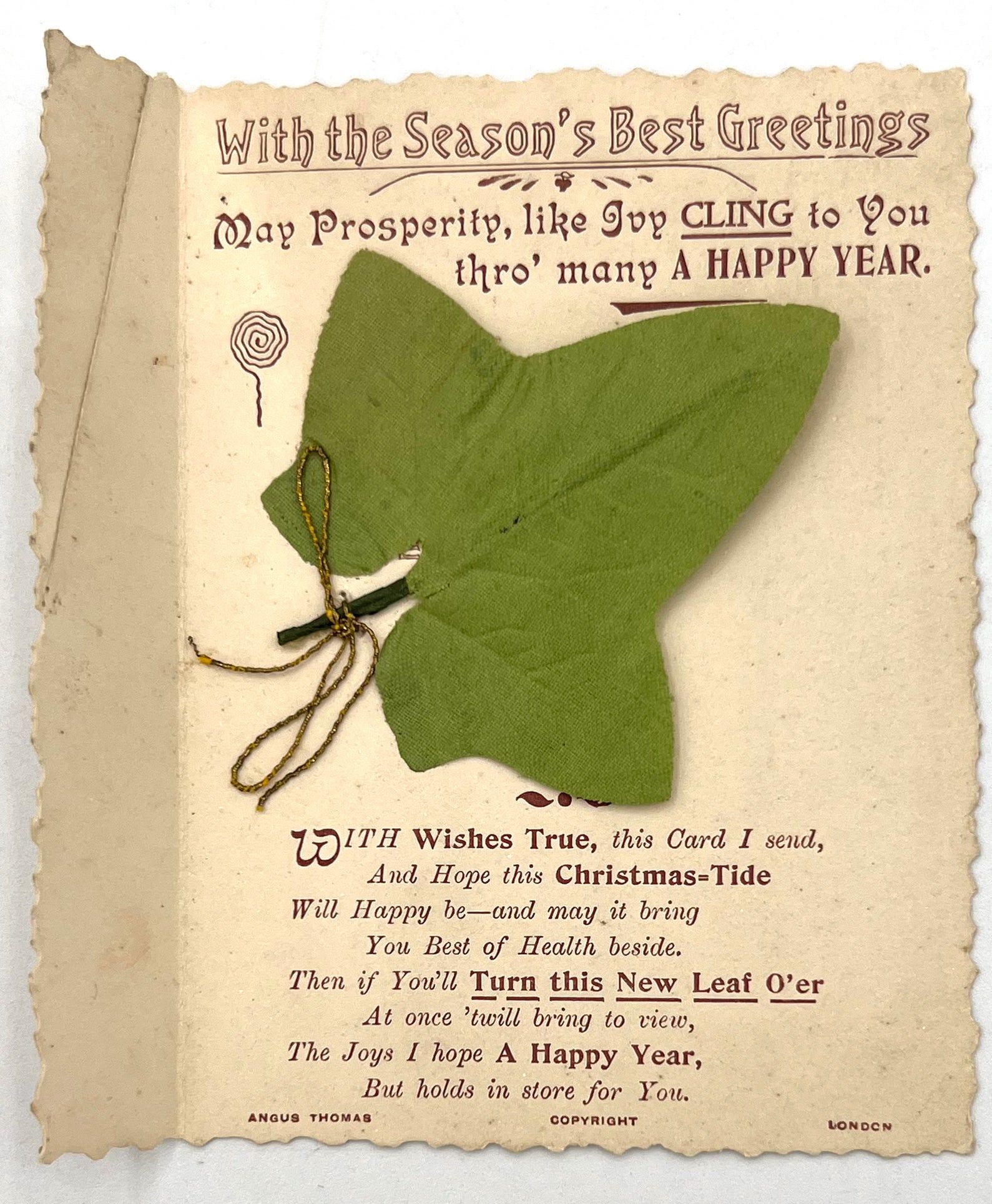 London, England: Angus Thomas, 1890. Very good. Minor damage to wire holding leaf underneath. Light toning.. A charming "paper with a secret" style holiday greeting card, featuring a hidden message underneath a silk leaf that reads: "Lasting Prosperity, Long Life, Evergreen Health, True Love, Good Luck, And Hosts of Friends". Contemporary ink inscription on verso: "To Dear Fred from Ruth". Measures approx. 4.5" by 3.25