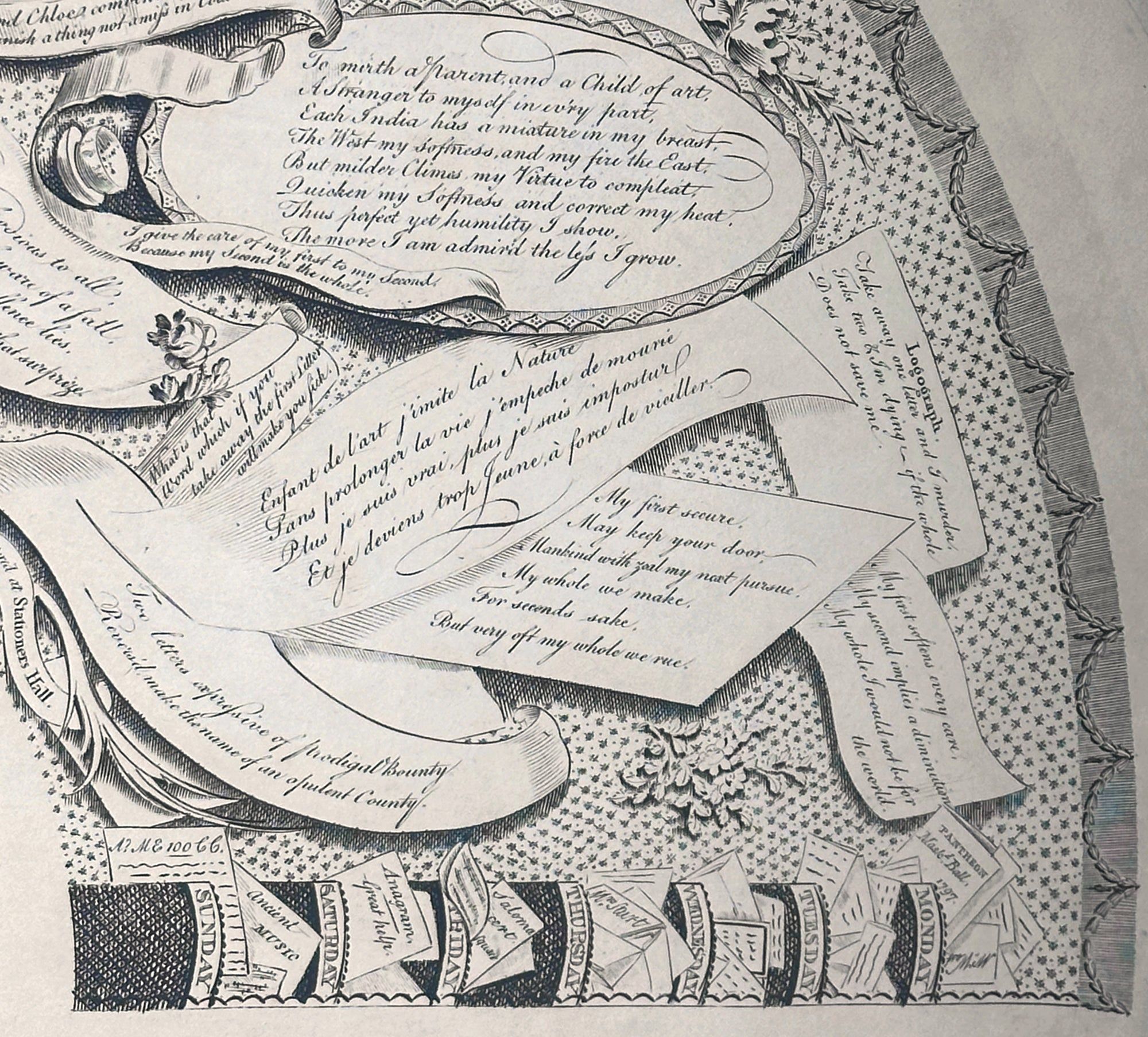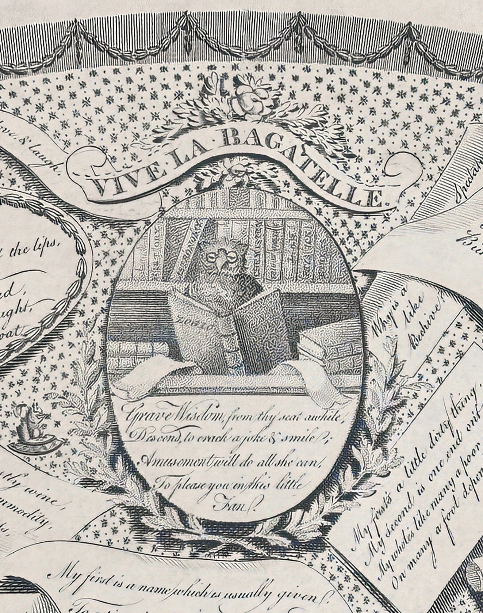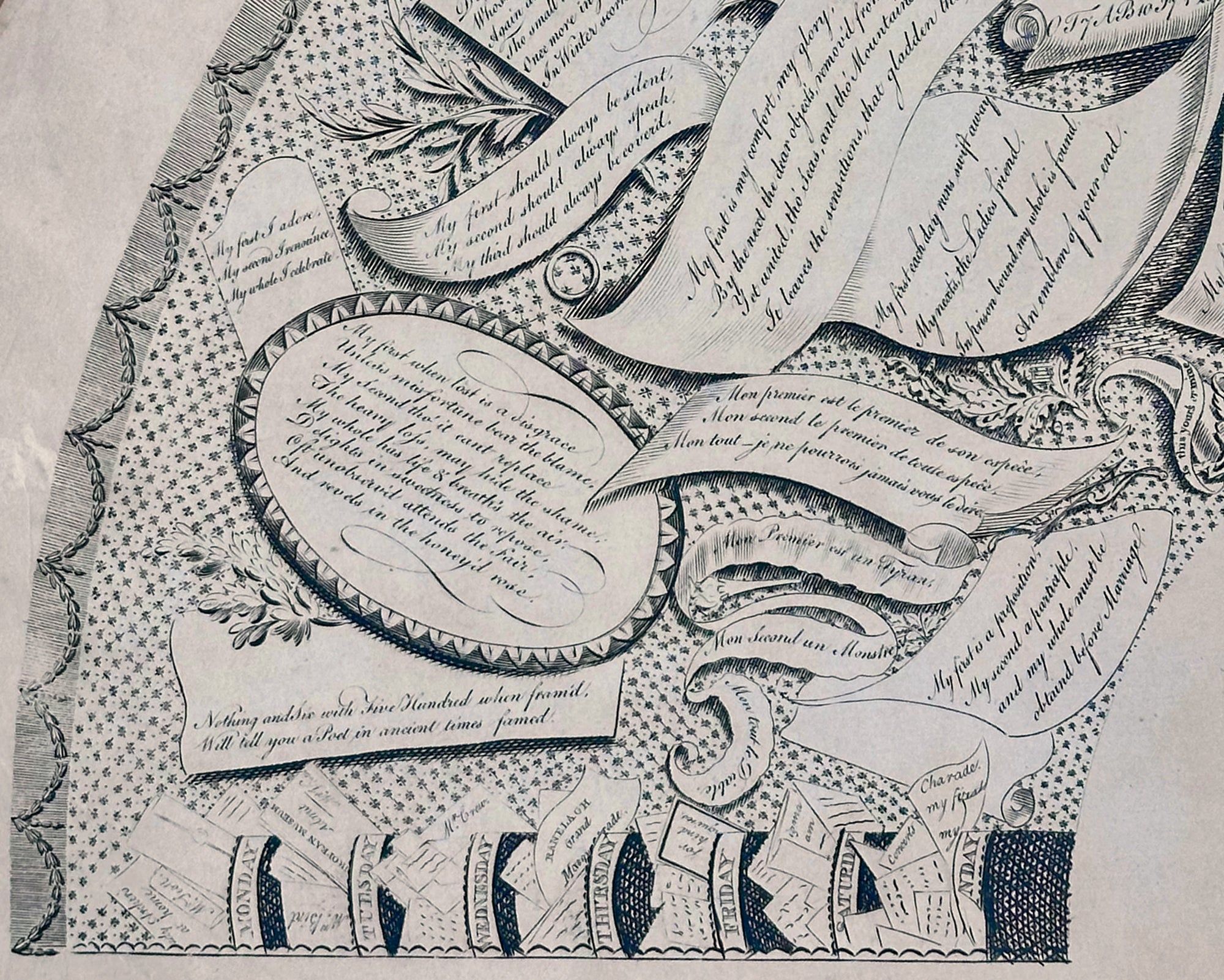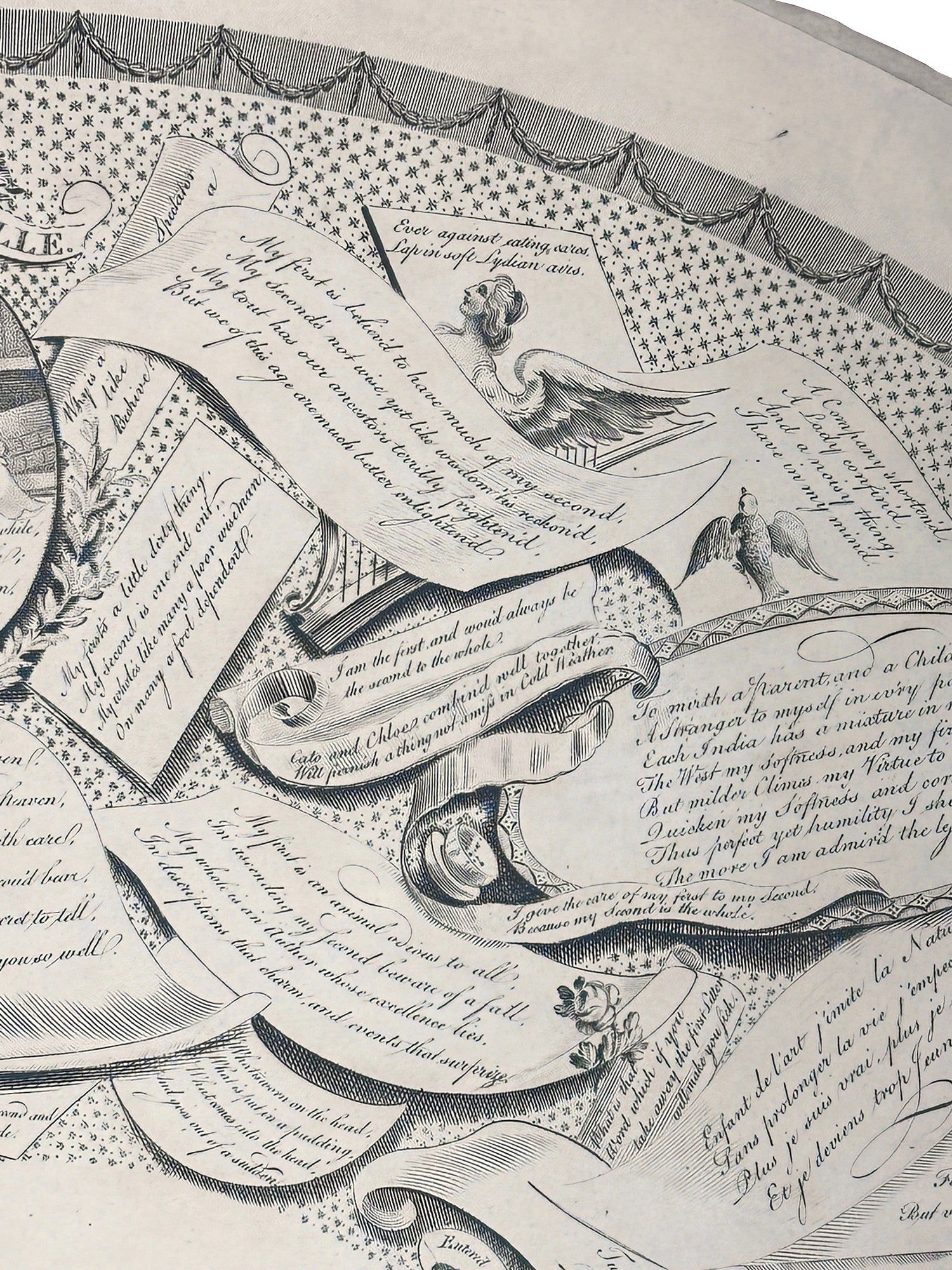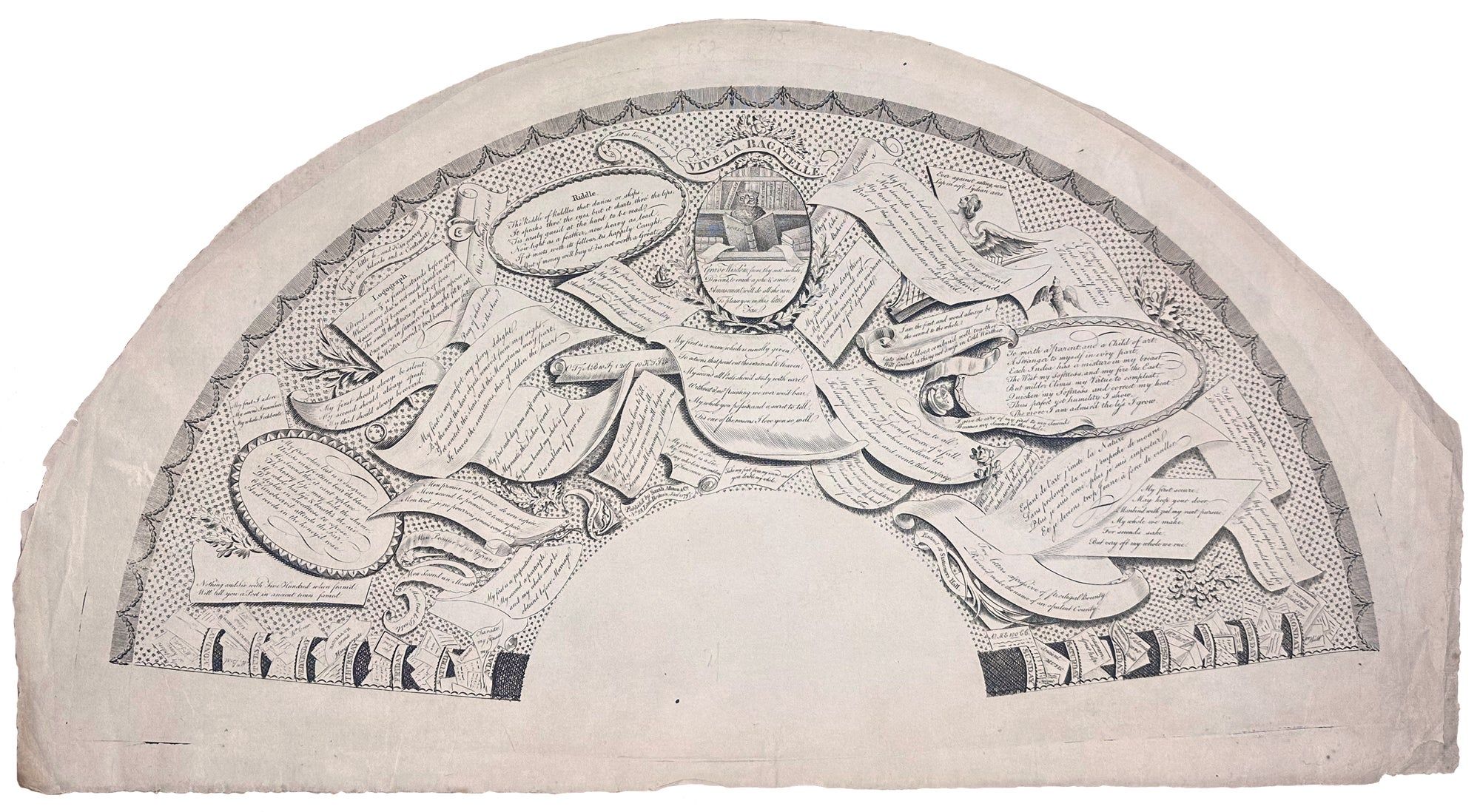[London]: Sarah Ashton, No. 28, Little Britain, 1797. Original example of London fan maker Sarah Ashton’s delightful “Vive la Bagatelle” design, published on New Year’s Day in 1797. Instructing its bearer to “live, love, & laugh,” this “conundrum fan” offers hours of diversion in the form of riddles, jokes, and word games, scattered across the fan in a tromp l’oeil profusion of scrolls, scraps, and ribbons. In the central medallion, the owl of Minerva peers up from a book in the library, above the dedication: “Grave Wisdom, from thy seat awhile, / Descend to crack a joke & smile; / Amusement will do all she can; / To please you in this little Fan.” Along the base of the fan is a calendar file, overflowing with invitations for the coming two weeks: museums, masquerades, concerts, balls, and visits with friends. Publisher Sarah Ashton was admitted to the Worshipful Company of Fan Makers in 1770. She produced a series of elaborate fan designs over the next three decades, many of them featuring literary themes. Schreiber 207. We locate examples at the London Museum, the Met, Huntington, UCLA, Yale, and Washington University. A rare survival, at the intersection of printing and fashion, in fine condition. Engraved fan design, measuring 10 x 19.5 inches, laid on backing sheet measuring 11 x 21 inches, as issued in preparation for mounting on sticks. Edges untrimmed, ghost of old hinging tape to verso.