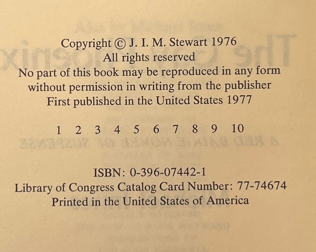 New York: Dodd, Mead and Company, 1977. First Edition. Hardcover. Very Good/Near Fine. Very Good in a Near Fine jacket, unclipped ($6.95), toned at the flaps. Orange cloth, faintly rubbed, with black ink lettering on the spine. Firmly bound with a slight forward lean, adhesive residue on the endpapers, clean otherwise. A Sir John Appleby mystery.