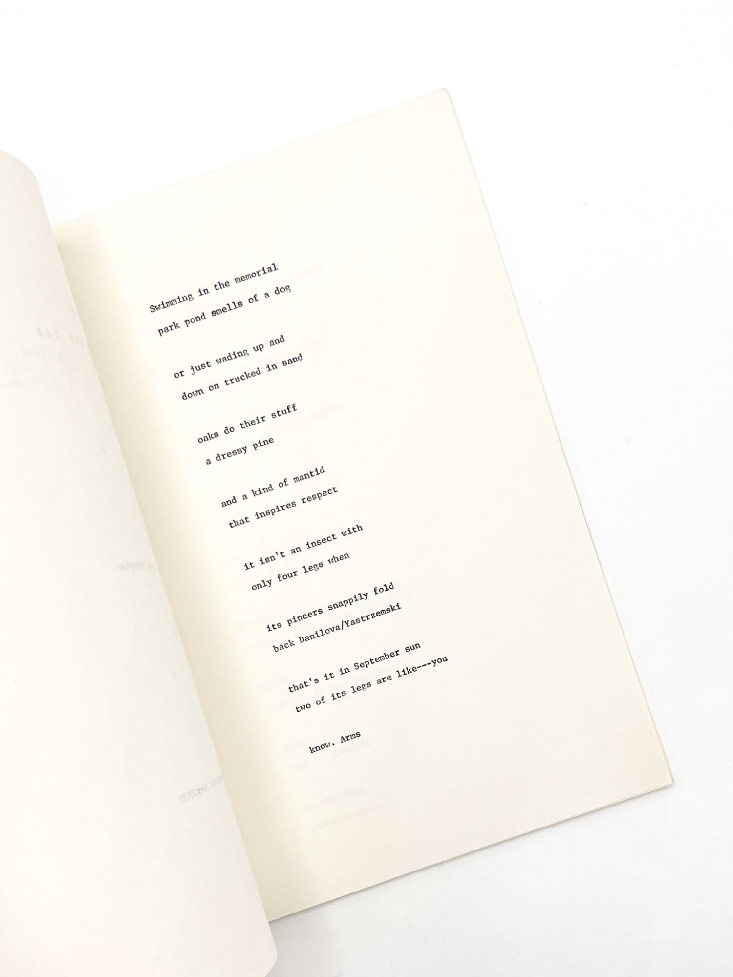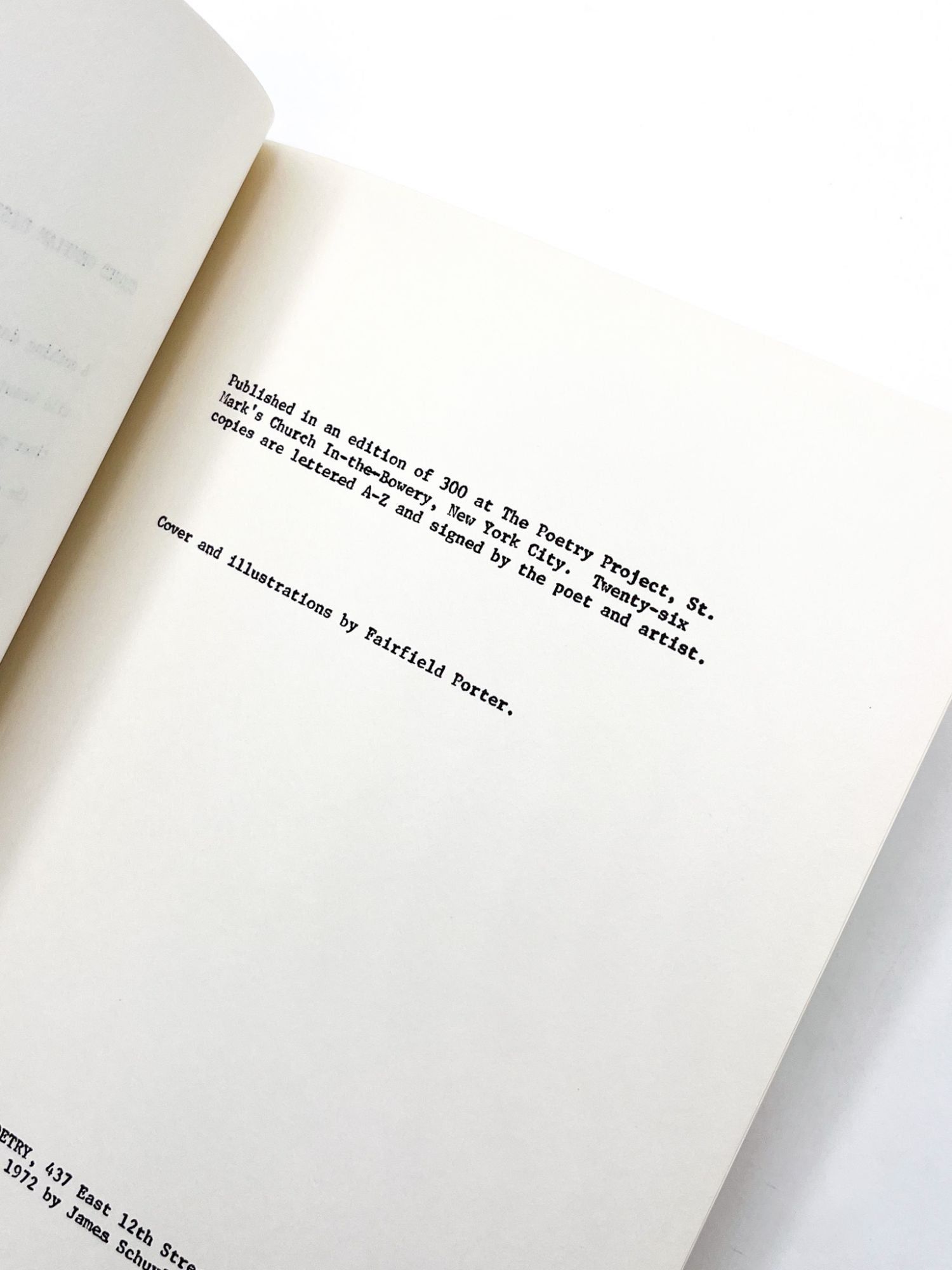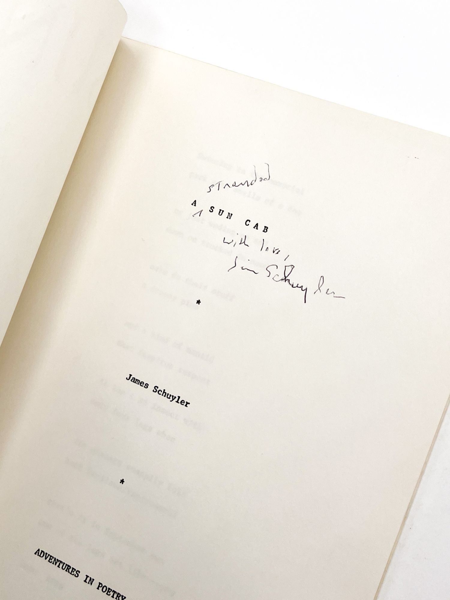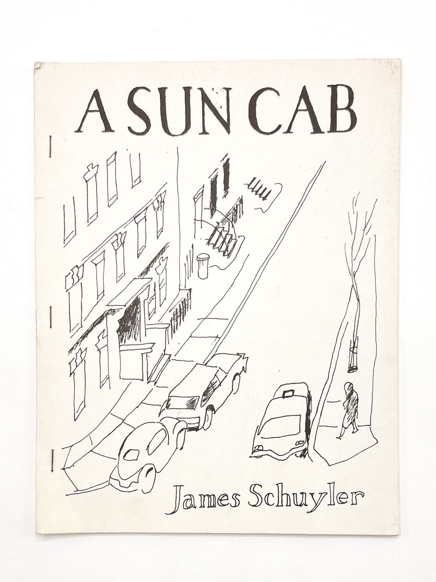 (New York): Adventures in Poetry, 1972. First printing. Near fine.. Inscribed first edition of this collection from the New York School great, issued by Larry Fagin's press and perfectly illustrated by Fairfield Porter. 11'' x 8.5''. Side-stapled pictorial wrappers designed by Fairfield Porter. [27] pages printed rectos only on as many leaves, plus three full-page reproduced black-and-white illustrations by Porter; offset cover and illustrations, else mimeographed throughout. One of 300 copies. Inscribed by Porter to the title page ("with love, Jim Schuyler") and adding "^Stranded" to the title (i.e. "A Stranded Sun Cab"). Minor toning, rubbing. Touch of rusting to staples. Else clean and sound.