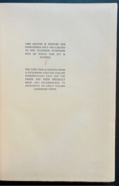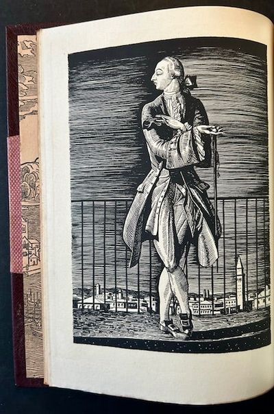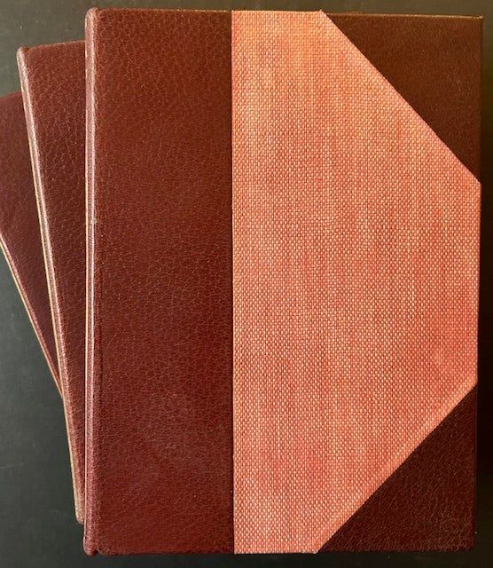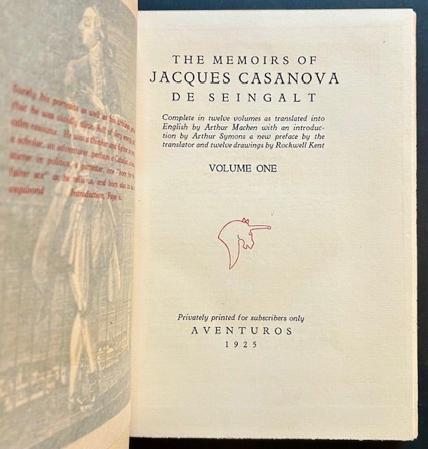 Aventuros, 1925. 1/2 morocco. Near Fine. Rockwell Kent. The 1925 limited edition. #8 OF THE FIRST 150 COPIES (WITHIN A LARGER LIMITATION OF 1,000 COPIES) BOUND IN A SUMPTUOUS, DEEP-RED HALF-MOROCCO, WITH WONDERFUL GILT-TOOLING ALONG THE SPINES. Complete in 12 octavo volumes, with top-edges gilt. All 12 volumes bright, clean and Near Fine. "Translated into English by Arthur Machen, with an Introduction by Arthur Symons, a new Preface by the translator and twelve drawings by Rockwell Kent". Additionally, stated along the limitation page: "The Type Used is Derived from a Fifteenth Century Italian Handwrought Face and the Paper Has Been Specially Made and Watermarked to Reproduce an Early Italian Handmade Paper