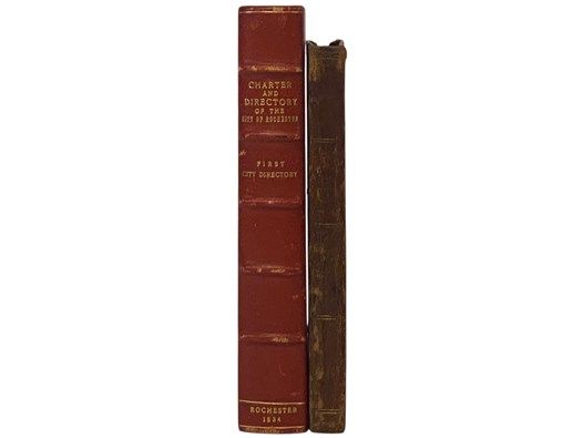Rochester, New York: Marshall & Dean Printers, 1834. First Edition. Hard Cover. Good/No Jacket. First edition. Map complete, with closed tear along bottom edge and smaller closed tear to middle crease, board edges rubbed with corners a bit exposed, front hinge weakening with first gathering loose, foxed throughout, pencil name and mathematical calculations on front endpapers. Housed in custom leather and cloth box with red cloth chemise. 1834 Hard Cover. 87, [1], [1]-98, [14] pp. Folding map precedes text, local advertisements follow text. The first printed directory of citizens and businesses of Rochester, New York, which was incorporated as a city the same year this guide was published.