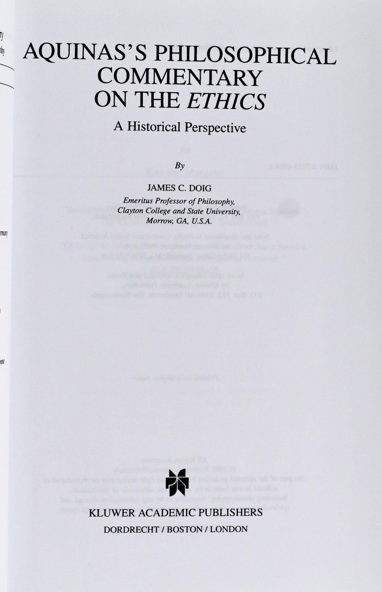 Dordrecht/ Boston/ London: Kluwer Academics. Near Fine binding. Octavo; in glossy boards; xvii, 311 pages including the Index; a couple of dark smudges on the contents page, otherwise a clean copy. ~~From the blurb on the back “Is Aquinas’s Sententia Libri Ethicorum and interpretation of Aristotle based on “principles of Christian ethics”? Or, do we have in that work a presentation of the foundation of Aquinas’s moral philosophy?”. Near Fine binding.