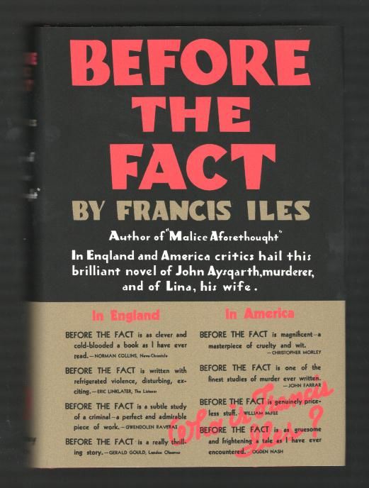 Garden City NY: Doubleday, Doran & Company, Inc.. Near Fine. 1933 (c.1932). Early printing. Hardcover. (lacking the original dust jacket, but encased in a professionally-made facsimile reproduction of same; see 2nd image posted with this listing) [nice clean copy, spine very slightly turned, extremely light wear to extremities]. "This is the story of Lina Aysgarth, who, after eight years, discovered that she was married to a murderer. It is not a shocker or a detective story, but a brilliant, disquieting, frightening study of a charming and thoroughly evil murderer." A Haycroft-Queen Cornerstone title, and the basis for the 1941 Alfred Hitchcock film SUSPICION, with Cary Grant as the charmer and Joan Fontaine as his milk-fed and very anxious bride. NOTE again that this book bears a FACSIMILE dust jacket, to serve the dual purpose of protecting the book from further wear and enhancing its appearance on the shelf; its presence has not been factored in to our pricing. .