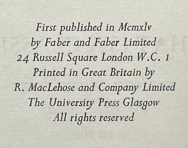 London: Faber and Faber, 1945. First Edition. Hardcover. Near Fine/Very Good. Near Fine in a Very Good jacket, unclipped (3s. 6d. net), lightly soiled, two scuffs across the spine. Blue cloth with gilt lettering on the spine, scuffs matching the jacket. Square and firmly bound, clean internally. The complete text of Eliot's speech at the organization's first annual meeting of which he was president.