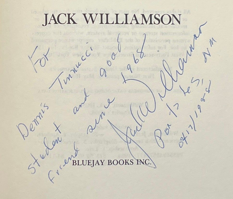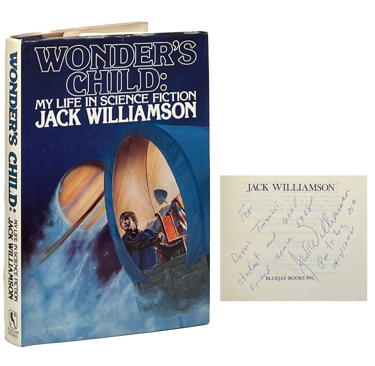 New York: Bluejay Books, Inc, 1984. First Edition. Hardcover. Fine/Near Fine. Inscribed by Williamson on the title page. Fine in a Near Fine jacket, unclipped ($15.95), a crease down the front flap, lightly bumped at the edges. Quarter blue cloth with brown paper on the boards. Square and firmly bound, clean internally. Williamson's memoir about his writing career, including anecdotes about composing his most beloved stories and dealing with the likes of Hugo Gernsback and John W. Campbell.
