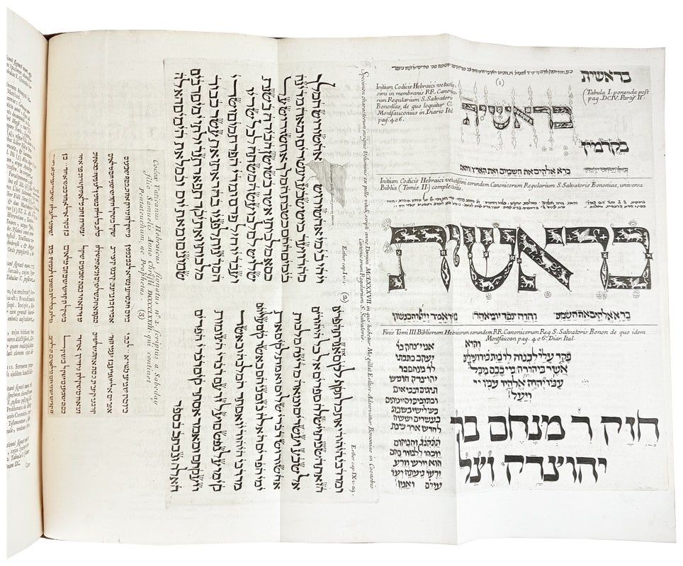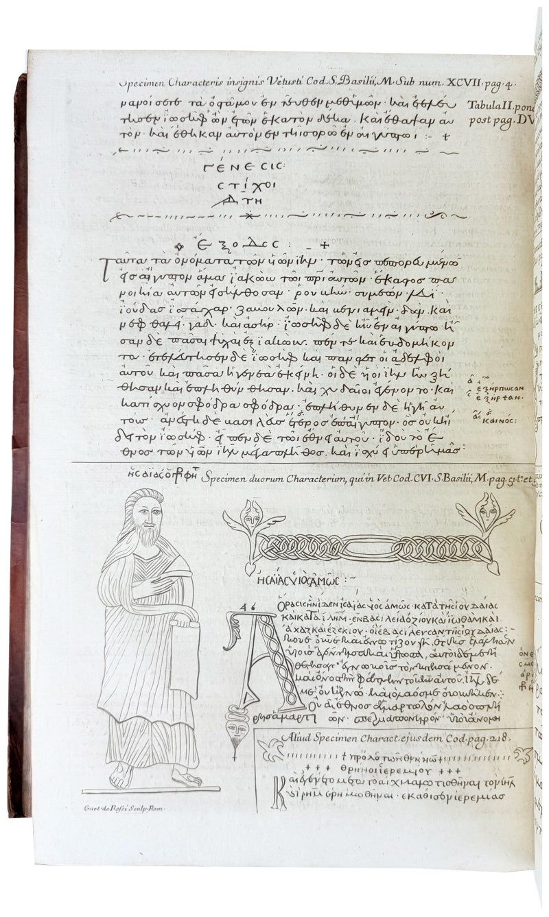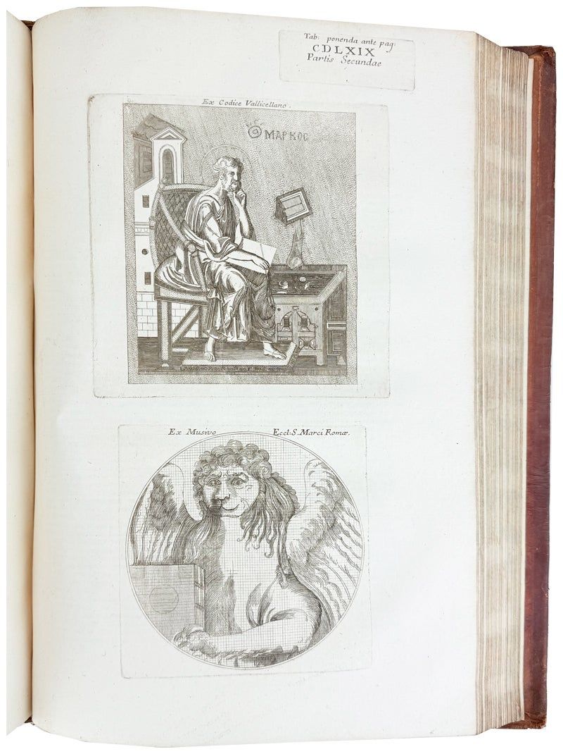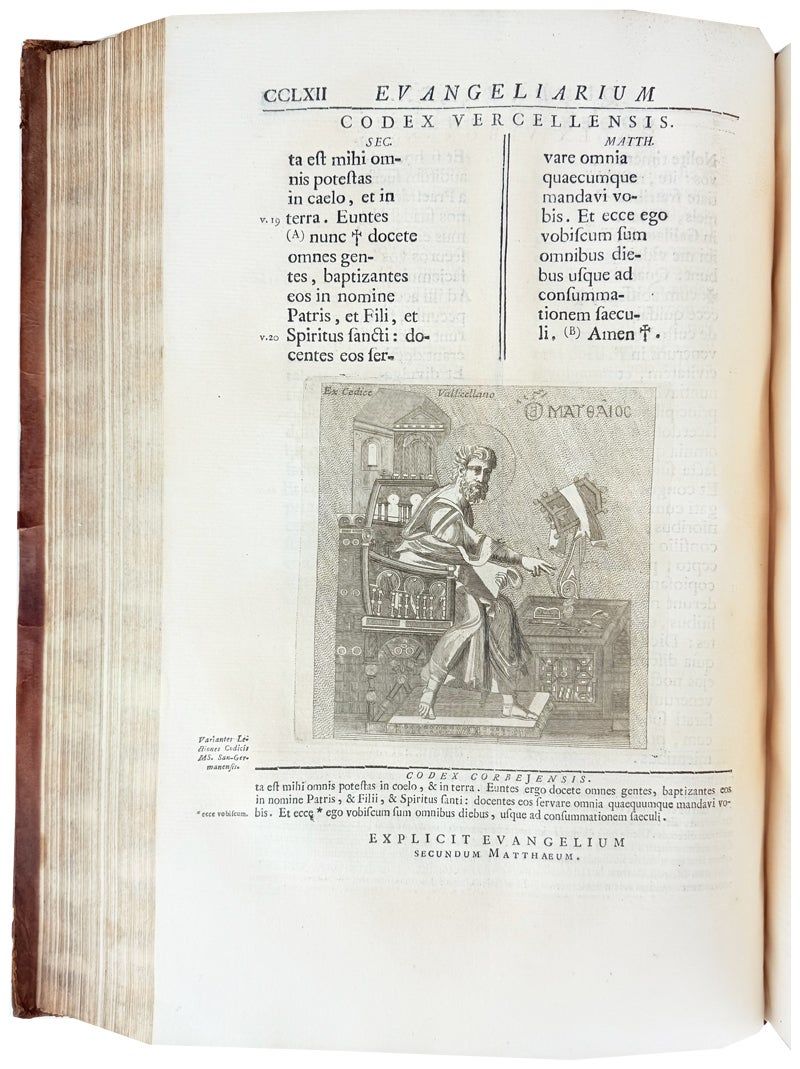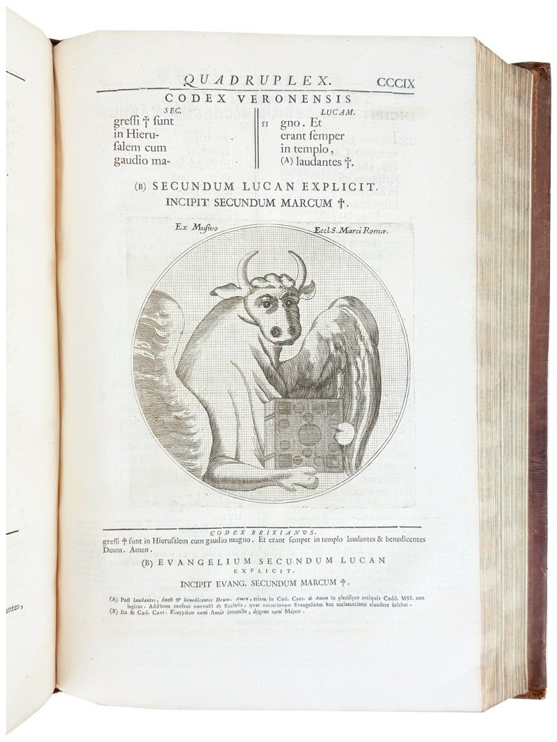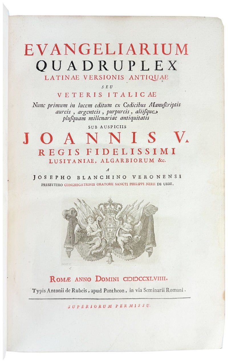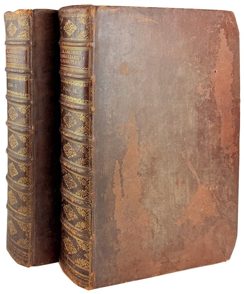 Romae [Rome]: Typis Antonii de Rubeis, apud Pantheon, in via Seminarii Romani, 1749. Very Good. Romae [Rome]: Typis Antonii de Rubeis, apud Pantheon, in via Seminarii Romani, 1749. First Edition. Four folio volumes (41x28cm) bound in two; full contemporary calf with seven raised bands, gilt decoration, and leather title labels to spine; sponge painted edges; marbled endpapers; half titles; titles in red and black; 96; DLXXII; [3] pp.; [14]; DCXXXIV pp., 19 plates, 5 of which are folding, collated, presumed complete. Wear to boards with exposure to edges; surface scraping and flaking; binding sound. Engraved armorial bookplate of Bartholdi Nicolai Krohn of Hamburg to front pastedowns; old notes to preliminaries; else unmarked; a Very Good set of Bianchini's collation of the Vercellensis, Veronensis, Corbeiensis, and Brixianus codices. Complete sets uncommon in retail.