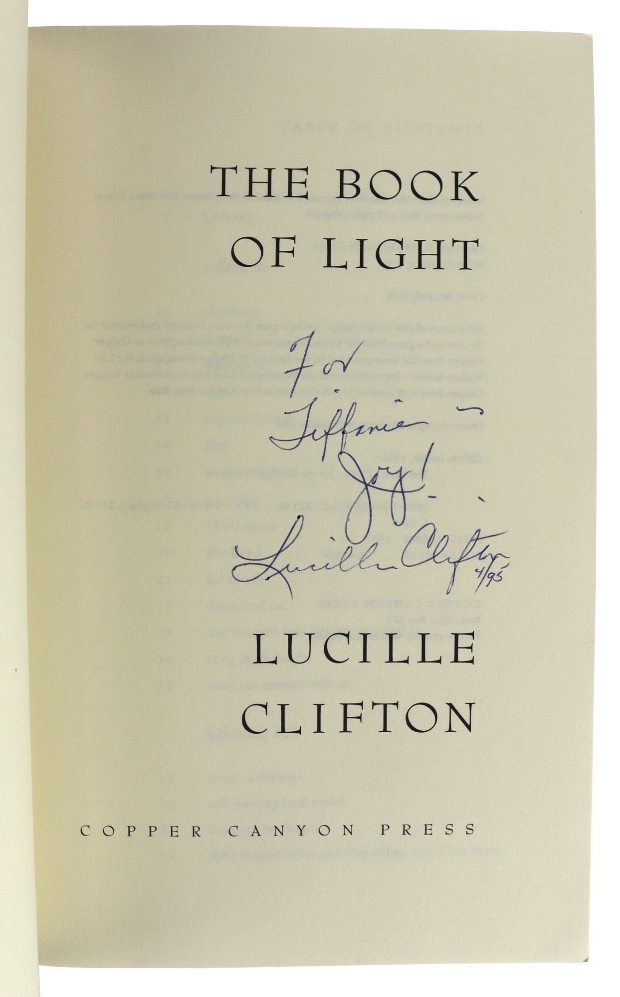 Port Townsend, WA: Copper Canyon Press, 1993. Very Good. [Port Townsend, WA]: Copper Canyon Press, [1993]. Second (1994) printing. Slim octavo (22.5cm); publisher's glossy pictorial card wrappers; 76pp. Wrappers a bit rubbed and dust-soiled at margins; Very Good overall. Inscribed and signed on title page, "For Tiffanie ~ Joy! Lucille Clifton / 4/95.