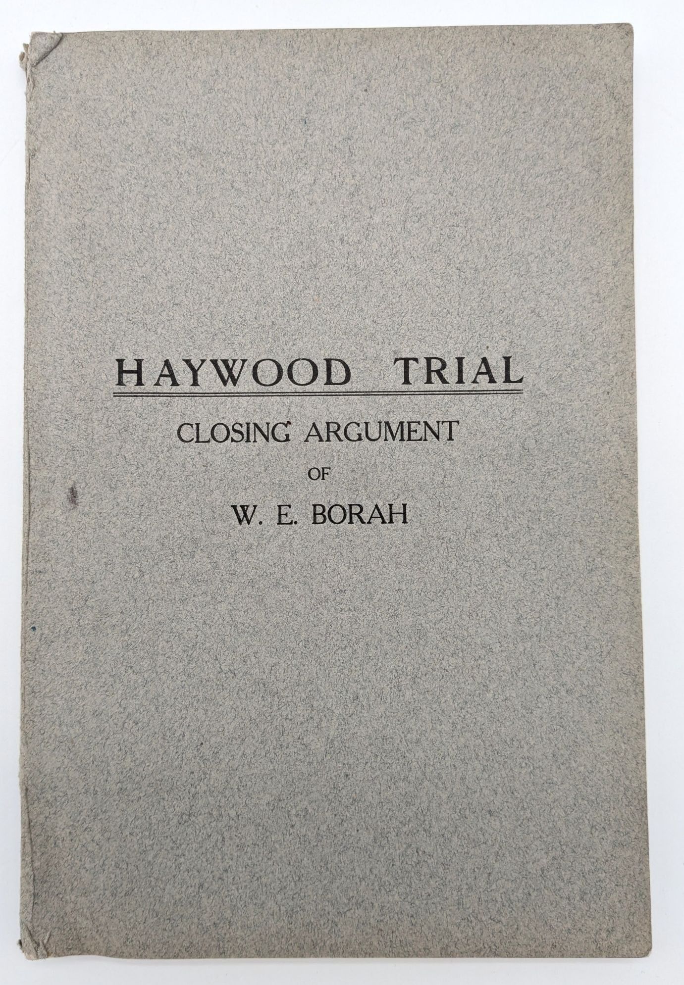 Boise, ID: The Statesman Shop, 1907. First edition. Paperback. Very Good. 130 pp. Octavo [23 cm]; perfect bound, printed wrappers. Some light wear and soil, bumped at the corners. Internally clean and bright. Full transcription of Borah's closing statement as prosecuting attorney in the case of Idaho vs. William D. Haywood, et al., for the 1905 murder of former Idaho Governor Frank Steunenberg. Borah lost the case to the brilliant defense of Clarence Darrow (the assassin was eventually discovered to be Harry Orchard, a former Wobbly turned stool-pigeon for the Cripple Creek Miner's Association). Though unsuccessful in prosecuting this case, Borah went on to a lengthy career in politics, serving six consecutive terms as U.S. Senator from Idaho. [Not in Miles. However, Miles 3626 lists a different, excerpted version of this publication.].