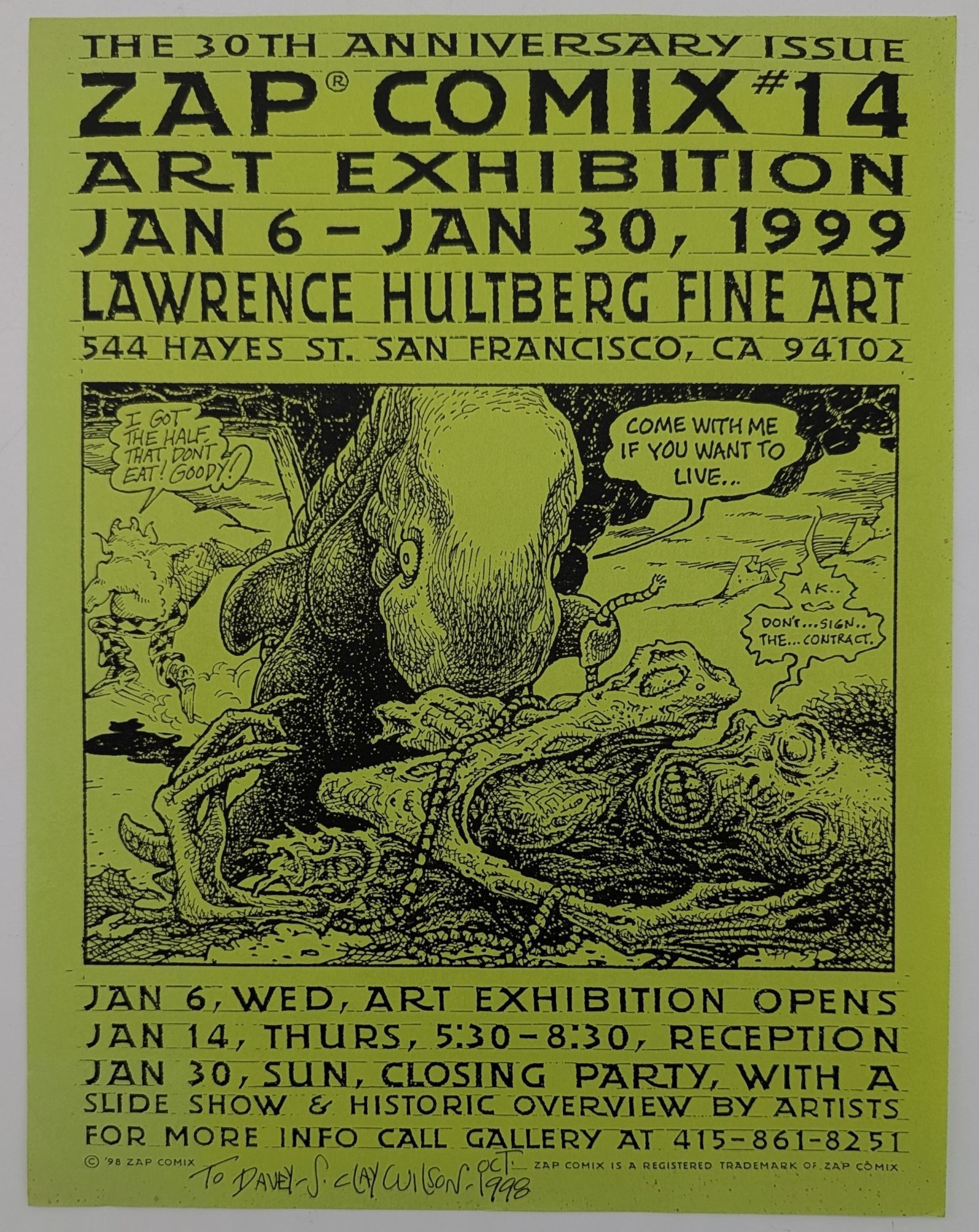 The 30th Anniversary Issue Zap Comix #14. Art Exhibition Jan 6 - Jan 30, 1999. Lawrence Hultberg Fine Art. 544 Hayes St. San Francisco, CA 94102