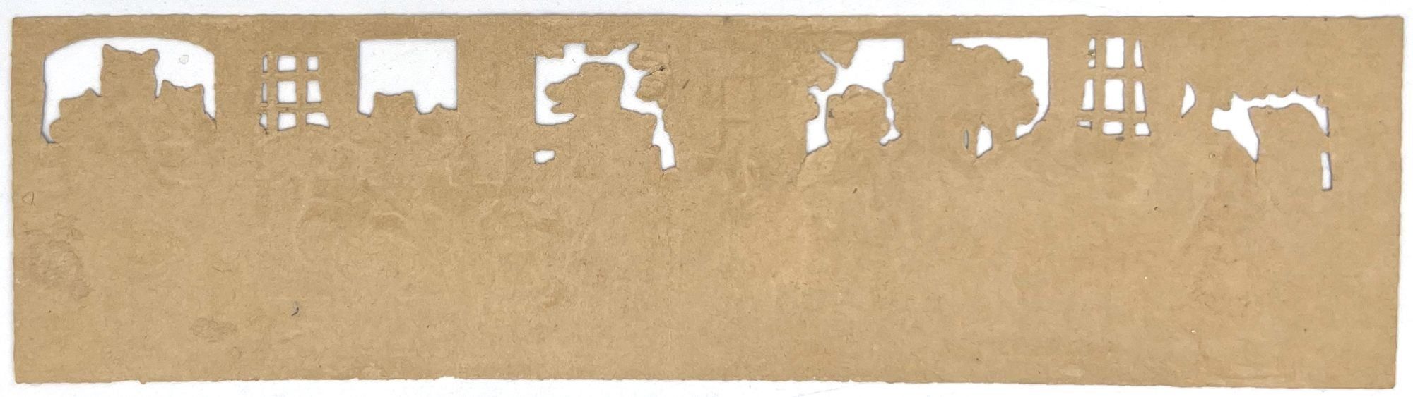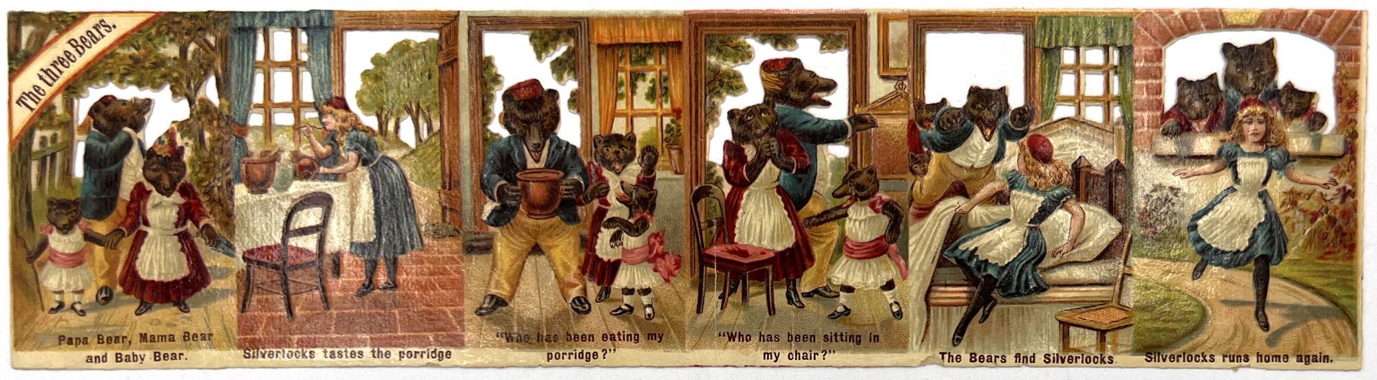 N.pl: N.p., Late 19th century. Very good to near-fine. Light toning.. A full, uncut sheet of Victorian scraps depicting the story of "The Three Bears" (Interestingly, the little girl character is referred to here as "Silverlocks" instead of "Goldilocks"). These sheets were intended to be folded into a miniature accordion fold book. It is uncommon to find full sheets of Victorian scrap, as well as these miniature books. This sheet includes six panels illustrating the story, and measures approx. 2.25" by 8.75". It has been embossed, chromolithographed, and die-cut.