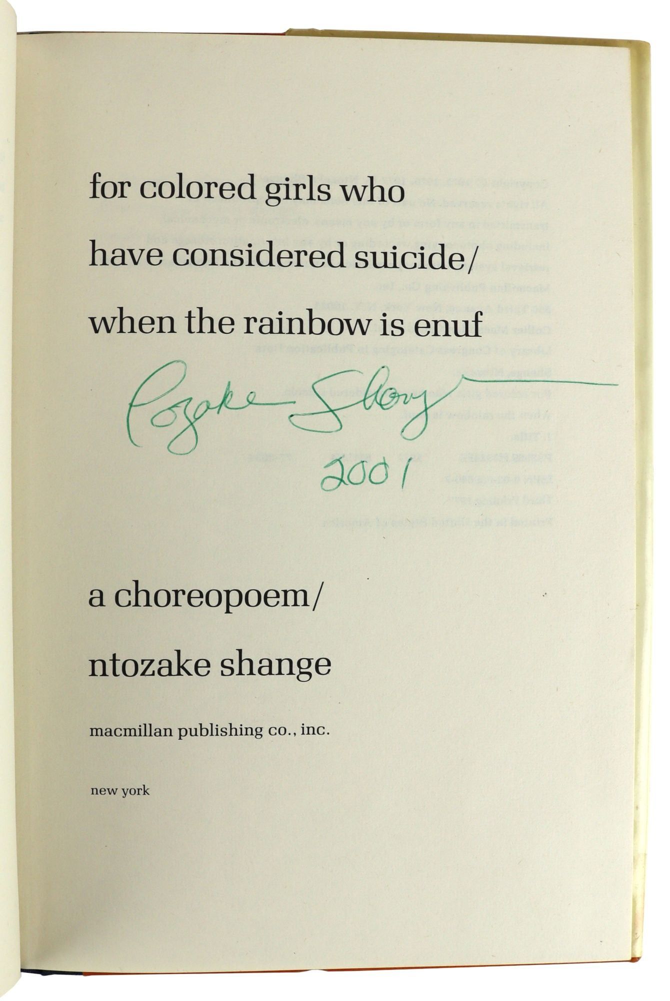 New York: Macmillan Publishing Co., Inc, 1977. Very Good/Very Good. New York: Macmillan Publishing Co., Inc., 1977. Third printing. Signed in green ink by Shange without inscription on title page, dated 2001. Price-clipped pictorial dust jacket. Yellow and orange boards and blue cloth spine with gilt lettering. Slim Octavo (24.1cm). 64 pp.