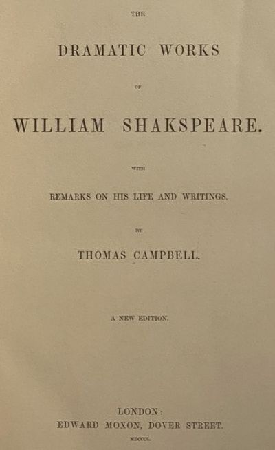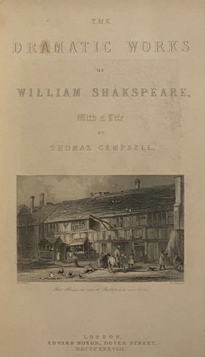 London: Edward Moxon, 1850. New Edition. Full-Leather. Good/No Jacket. 1850 reissue. Some splitting to joints, edges rubbed. Binding tight and square, pages clean, bright, and unmarked. A good candidate for recasing. lxxx, 432; [433]-960 pp. 9 1/2 x 6 3/4. Full sheep, gilt title and decorations in compartments, red morocco spine labels, marbled edges and endpapers. Engraved frontispiece portrait of Shakespeare, engraved title pages, two-column format. An 1850 new edition of The Dramatic Works of William Shakespeare, with a life of the author by Thomas Campbell. Includes all 36 plays from the First Folio, plus Pericles, Prince of Tyre, with the player's preface, ancient commendatory verses, glossary, and index.