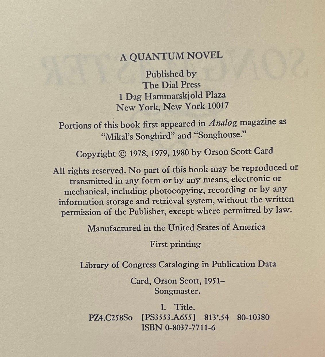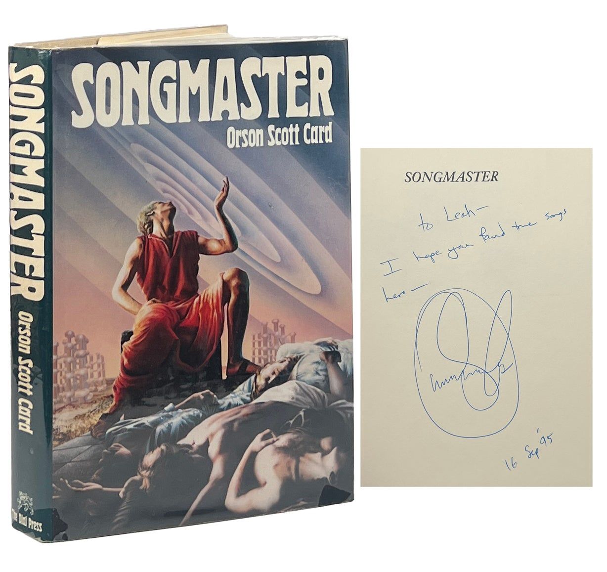 New York: Dial Press, 1980. First Edition. Hardcover. Near Fine/Near Fine. Inscribed by Card on the half-title. Near Fine in a Near Fine jacket, unclipped ($10.95), lightly toned, bumped at the edges. Beige cloth with blue gilt lettering on the spine. Square and firmly bound, lightly soiled at the top edge, clean internally. Card's novel expanded from his Nebula- and Hugo-nominated novelette "Mikal's Songbird.