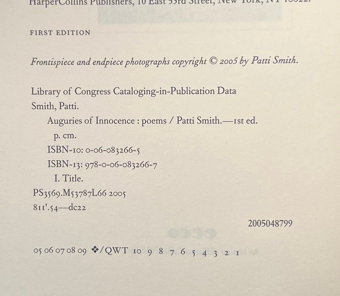 New York: Ecco, 2005. First Edition. Hardcover. Near Fine/Near Fine. Signed by Smith on the front endpaper, with a laid-in ticket to a Patti Smith performance at Chicago's Park West. Near Fine in a Near Fine jacket, unclipped ($22.95), a few scuffs. Cream cloth with bronze gilt lettering on the spine. Square and firmly bound, remaindered at the bottom edge, clean internally.