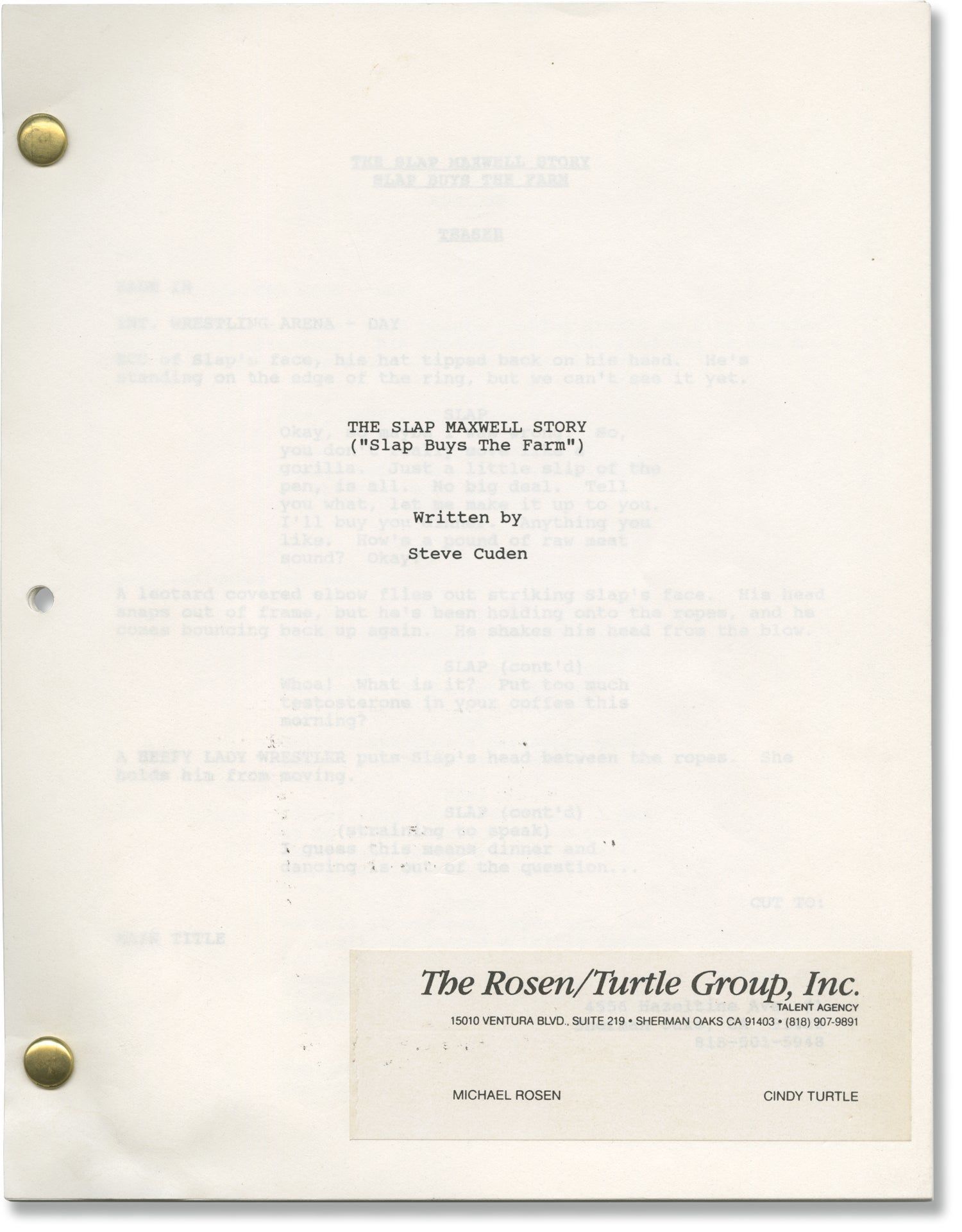 White untitled self wrappers, lacking rear wrapper, with adhesive label for the Rosen/Turtle Group Inc. talent agency at bottom right corner of front wrapper, and with credits for screenwriter Steve Cuden. Title page integral with front wrapper. 32 leaves, with last page of text numbered 32. Xerographic duplication, rectos only. Pages Near Fine, wrapper Near Fine, bound with two gold brads.