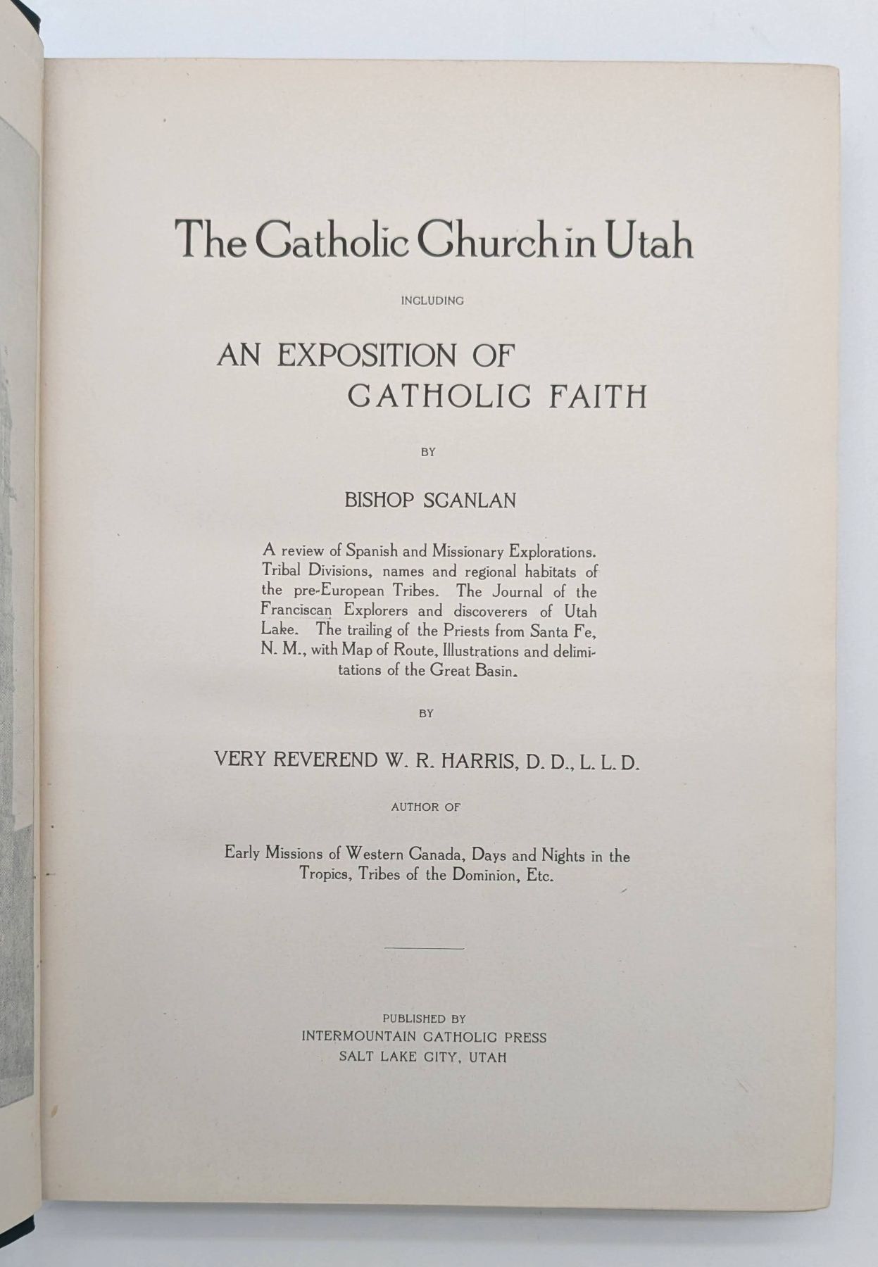 Salt Lake City, Utah: Intermountain Catholic Press, 1909. First edition. Hardcover. Very Good. 350 pp. Quarto [25 cm]; full green cloth covered and beveled boards with gilt lettering to front board and spine. Centerpiece design also in gilt. Illustrated with many photographs, maps, and drawings. With the double-page Map Showing Route Taken by Fr. Silvestre Velez de Escalante July 29th, 1776 – Jan 2nd, 1777. Numerous photographs of prominent Catholic buildings, including a double-page plate of Judge Memorial Home. The volume shows general light shelf wear; the boards are lightly scratched, and there is some rubbing and bumping to the edges and corners. Binding is solid and square. Internally clean and bright. Ex-libris Historian J. Roderic Korns, with his prior ownership label affixed to the front pastedown. Korns was a noted historian of the American West and author the work "West from Fort Bridger: The Pioneering of the Immigrant Trails Across Utah 1846–1850," which he completed with the assistance of Dale L. Morgan.