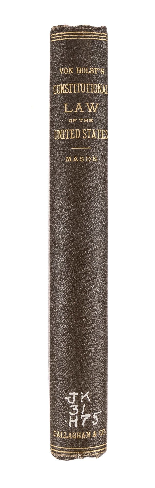 1887. Von Holst, H. Translated by Alfred Bishop Mason. The Constitutional Law of the United States of America. Chicago, IL: Callaghan, Authorized edition, 1887. v, 369 pp. Contemporary pebbled cloth, with gilt stamped spine. Boards lightly rubbed. Ex-library with white location label to foot of spine, bookplates to front pastedown, else internally clean. A very good copy. $25.